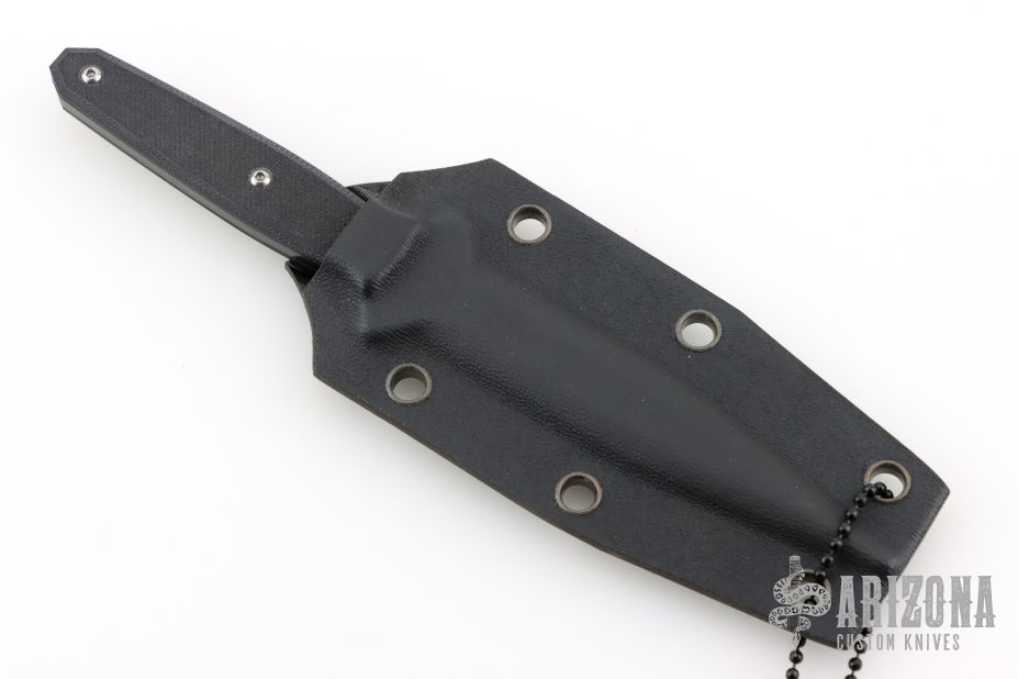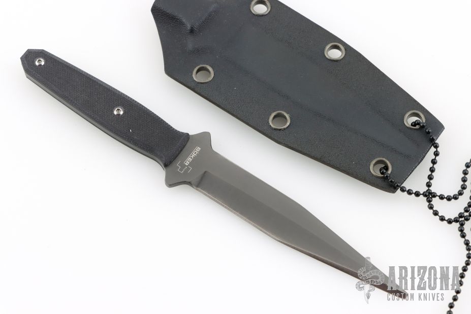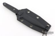 Canadian knifemaker Brent Beshara is known for his unique blade style called the Besh-Wedge®, which uses the full thickness of blade material completely up to the blade tip, providing maximum stability. The Applegate-Fairbairn version of the Besh-Wedge® has already hit the knife scene with a bang. The new Neck Wedge transfers this concept to the world of comfortable-to-carry backup knives. The blade steel is 440C stainless, getting optimum corrosion resistance by a titanium coating. Grip enhancing G-10 scales and a Kydex sheath complete the package and provide the demanding user with a professional tactical tool.
