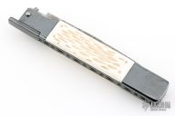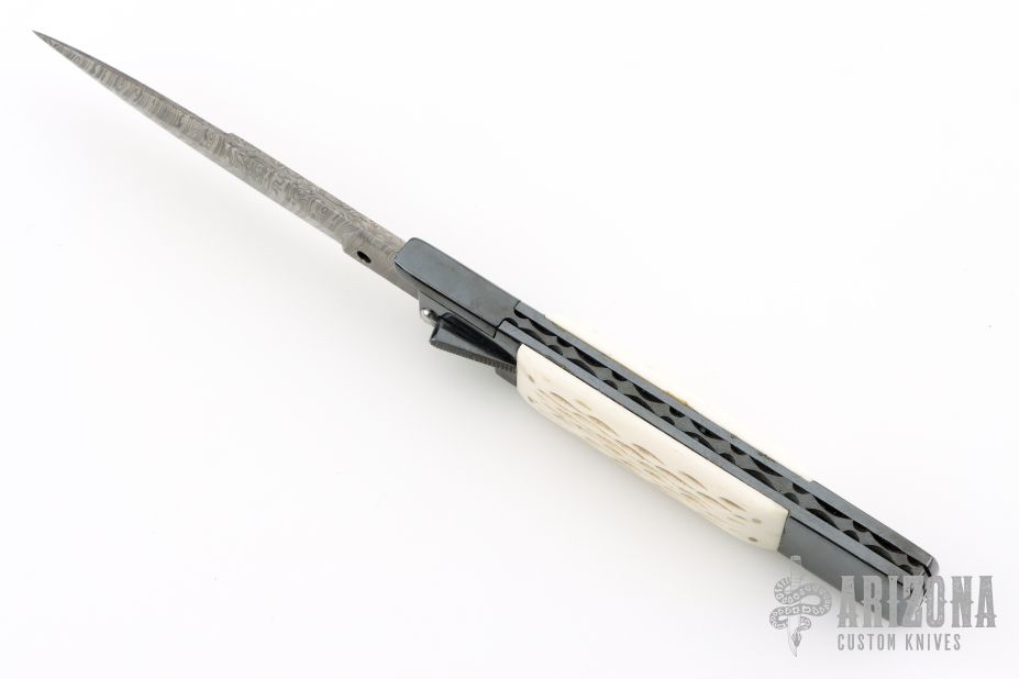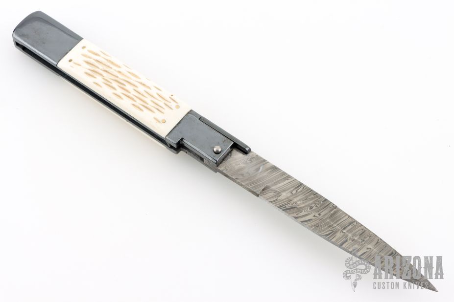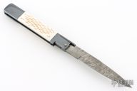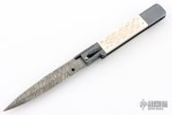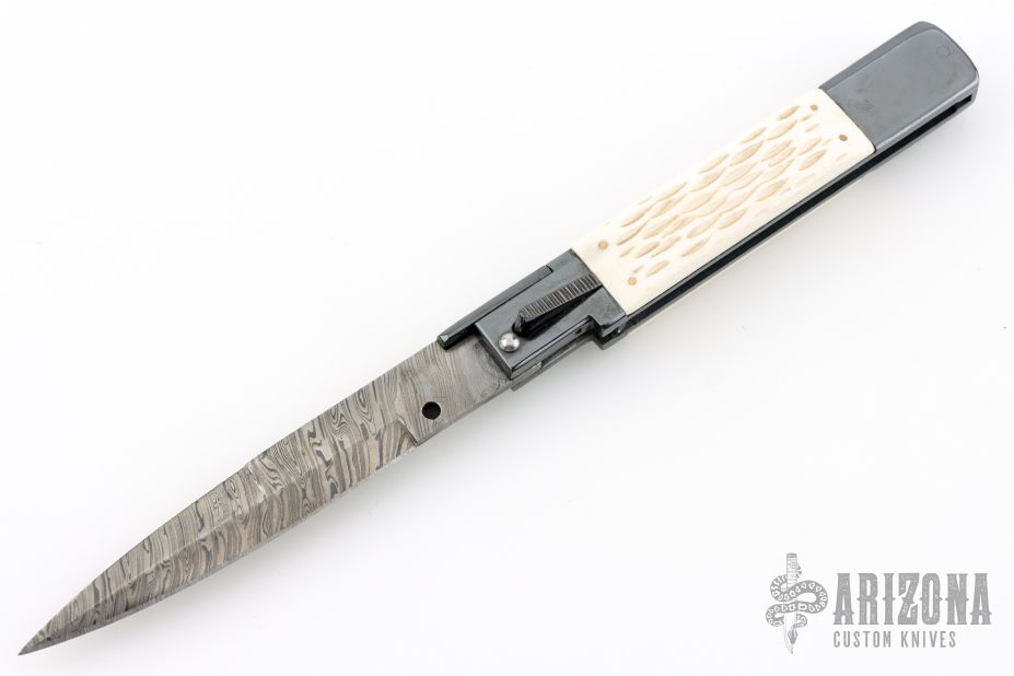 This Picklock Auto by Agasi Hambartsumian of Armenian Doctor Knives features a Damascus bayonet ground blade with a false top edge. The handle has a black polished stainless steel frame with fileworked stainless steel backspacer, jigged bone scales with brass pins. New from maker.