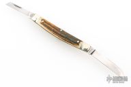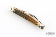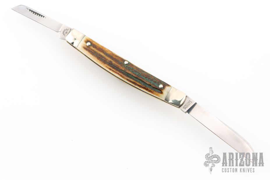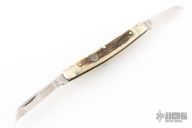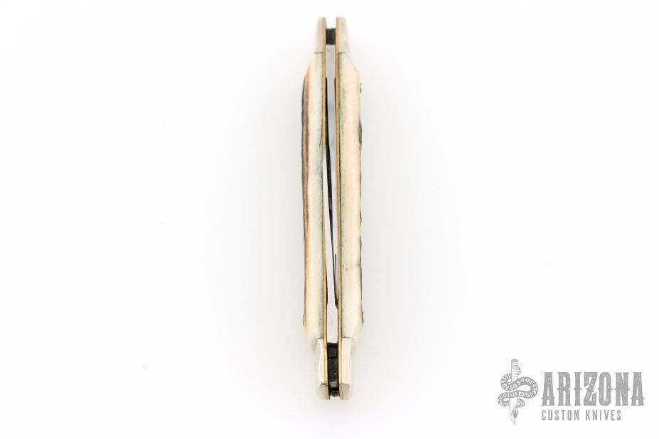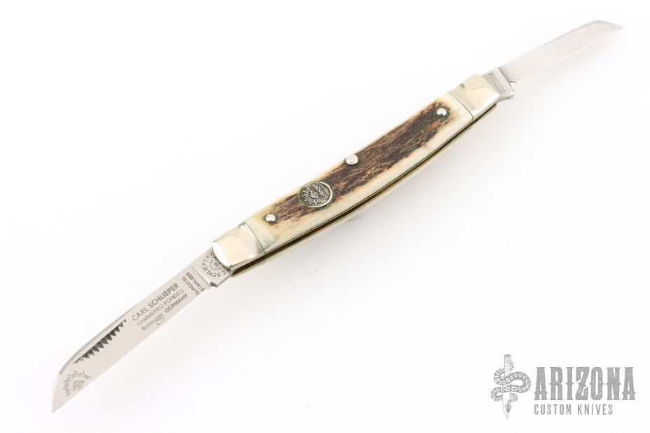 This slipjoint by Carl Schlieper features 2 mirror finished blades with nail nicks. The handle has fluted nickel silver bolsters front and rear, stag scales, brass liners and a stainless steel spring. Excellent condition.