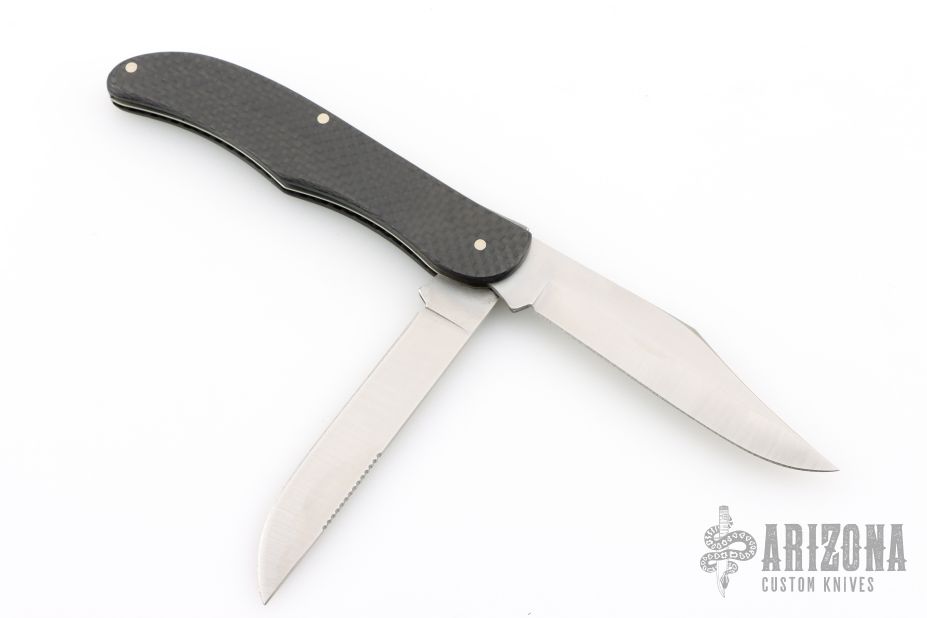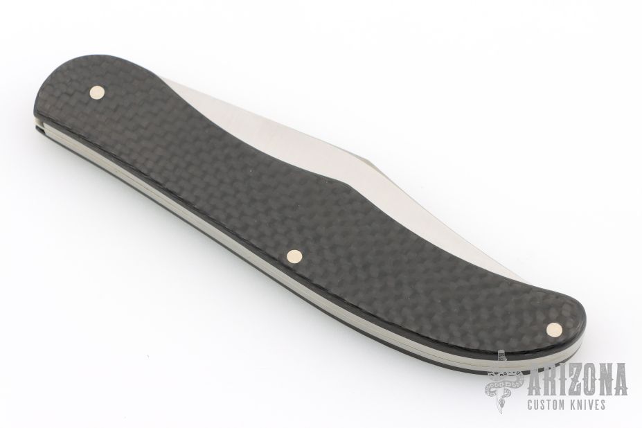 This Large Folding Hunter by Case knives features satin finished blades with nail nicks. The handle has carbon fiber covers, nickel silver center liner and stainless springs. Comes with original box, sheath and papers. Has a couple light scratches, otherwise excellent condition.