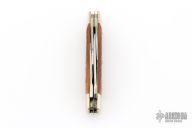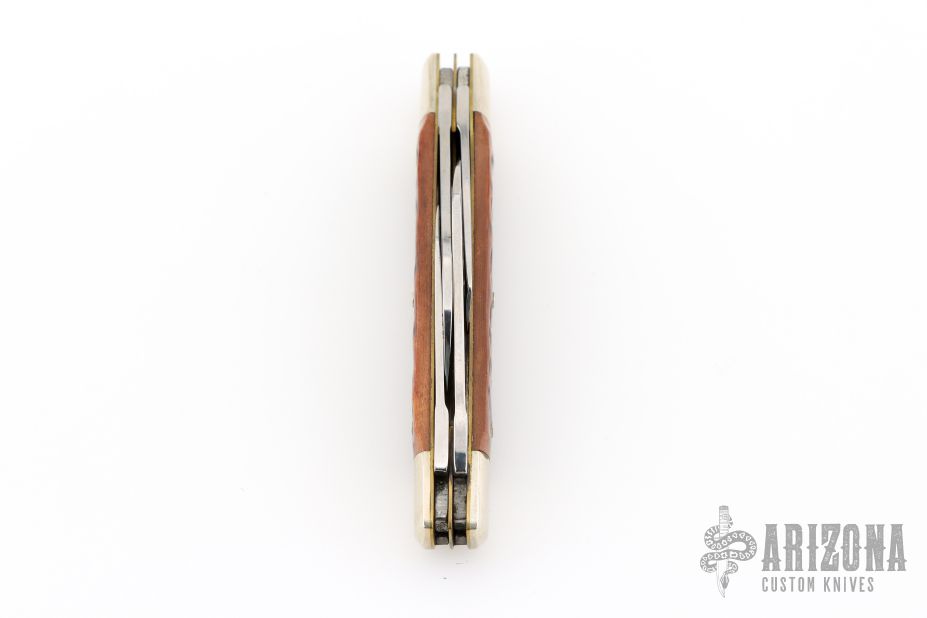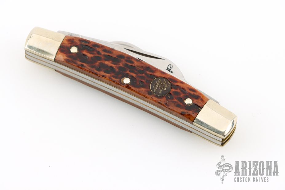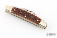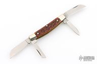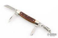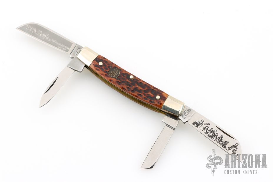 This is a four blade folder from Boker that commemorates the 200th anniversary of the Constitution. Engraving on two blades. Serial #4818. The handle has nickel silver double bolsters and jigged bone scales with medallion, brass liners and stainless steel springs. Has a couple very light scratches, otherwise excellent condition.
