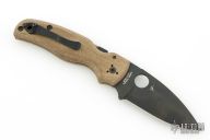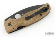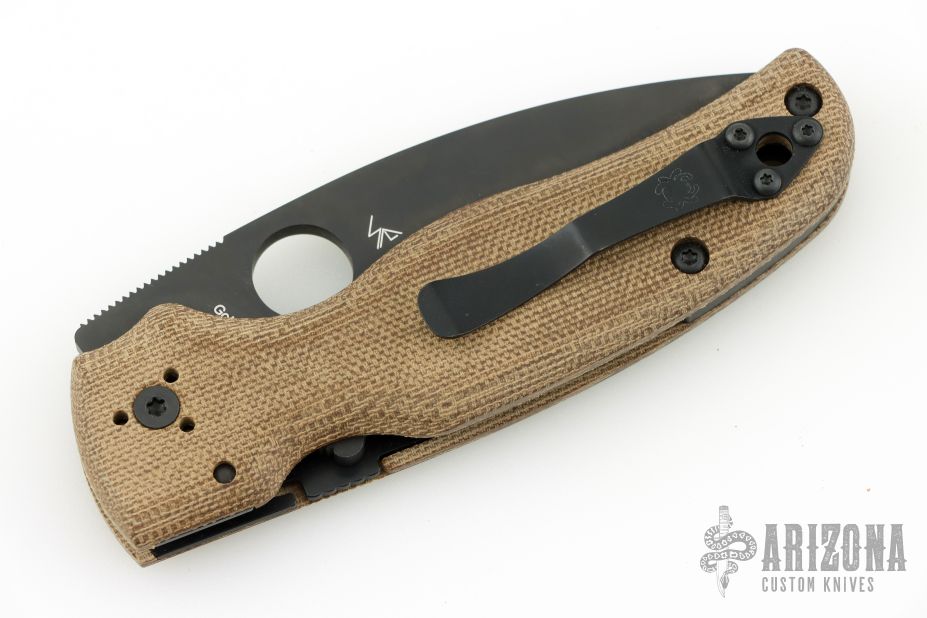 This Shaman by Spyderco features a matte black spear point blade with notched thumb and finger rests, thumbhole. The handle has olive drab canvas micarta scales, inlaid stainless steel liners and a black stainless steel backspacer, 4-way reversible black stainless steel clip, lanyard hole at the butt. Excellent condition. Comes with original box and papers.