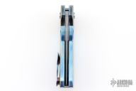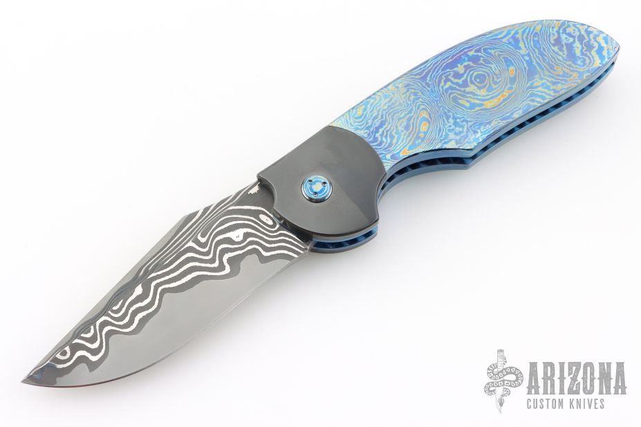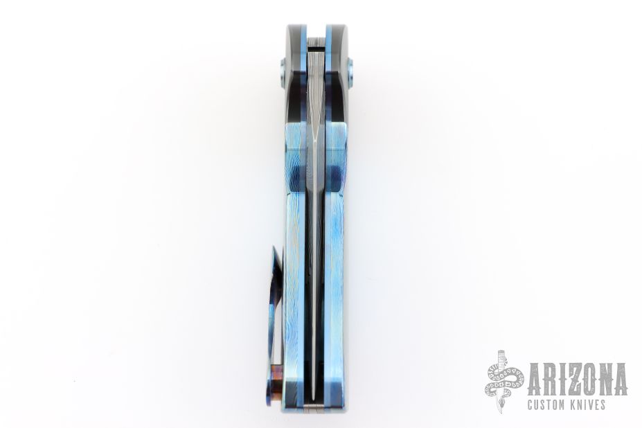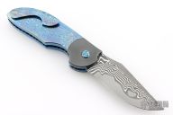 This Non-Flipper Flipper by Stan Wilson features a San Mai Damascus blade with a false top edge. The handle has matte finished zirconium bolsters with a MokuTi pivot, MokuTi scales, anodized titanium liners with jeweled interiors, San Mai Damascus backspacer, tip up MokuTi clip with hidden screws. The only visible hardware is the pivot. Nice action, lockup and blade seating. Comes with a zippered case. Excellent condition.