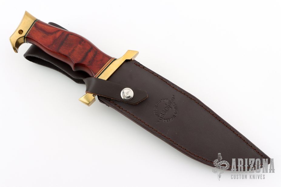 Gil Hibben lives and works in LaGrange, Kentucky. He began making knives part-time after his discharge from the Navy in 1956. He sold his first bowie knife for $45 and that sparked his long and famous career as a professional knife maker. While living in Seattle, WA after his Navy discharge, Gil worked as a machinist for Boeing Aircraft and learned a lot about metals and their properties. In 1964, while living in Salt Lake City, Utah, Gil started making knives full time. This was also the year Gil started making knives from the relatively new 440C steel. Although it is the industry standard now, Gil believes he was the first custom knife maker to use 440C. Hibben has been a full time custom knifemaker since 1957. Over the years Gil achieved fame as a premier custom knife maker and his work has been featured in, and on the covers of, national gun and knife magazines. He has established a whos-who following of collectors including John Wayne, Elvis Presley, Steve McQueen, Sylvester Stallone and Steven Segal or world leaders such as Israel's Defense Minister Moshe Dayan, the Sultan of Brunei and Vice-President Dan Quayle. He has taught and influenced some of the other legendary knife makers such as S.R. Johnson, Harvey Draper and Buster Warenski among countless others. Hibben designed the first line of Browning hunting knives in 1968, the American Kenpo Knife for Ed Parker. Gil's fame dramatically increased in 1988 when Sylvester Stallone, who had purchased several of Gil's custom knives for his own collection, asked Gil to design the now famous knife used in the movie Rambo III. Inducted into the Blade Magazine Cutlery Hall of Fame in 1990.