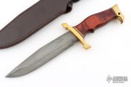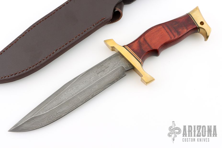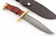 The Karate Master Knife was built for the martial artist in mind. A 7 1/2" razor sharp hand-forged folded Damascus steel drop point blade penetrates deep into any surface while the dark mahogany wood handle is accented brilliantly by a polished brass guard and pommel with classic Micarta spacers. Includes a leather belt sheath. 12 7/8" overall, 7 1/2" blade, .192" blade stock, 1.426" blade depth, hidden tang construction.