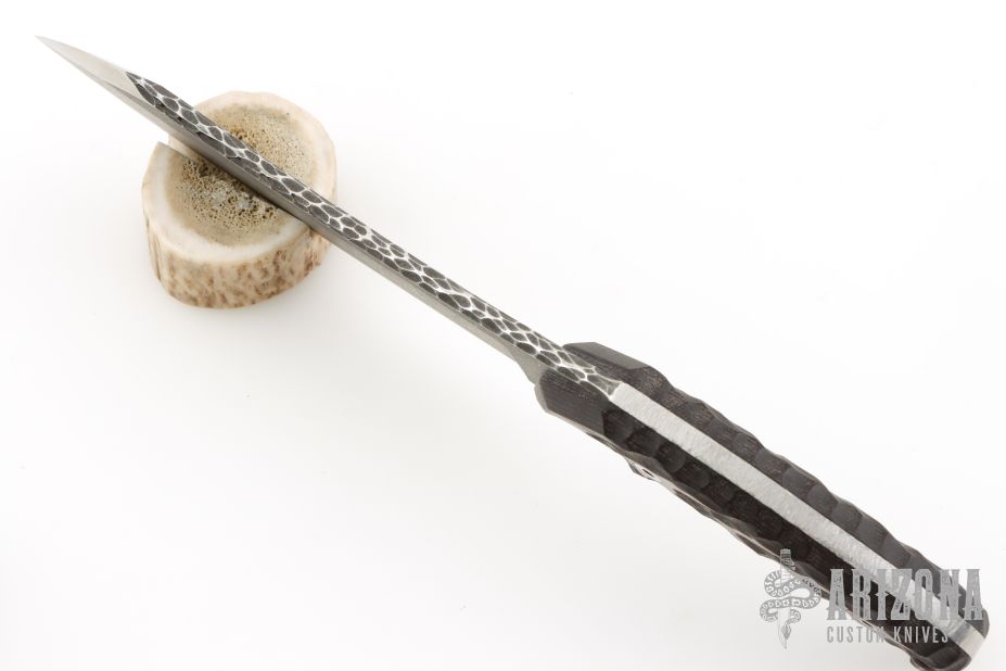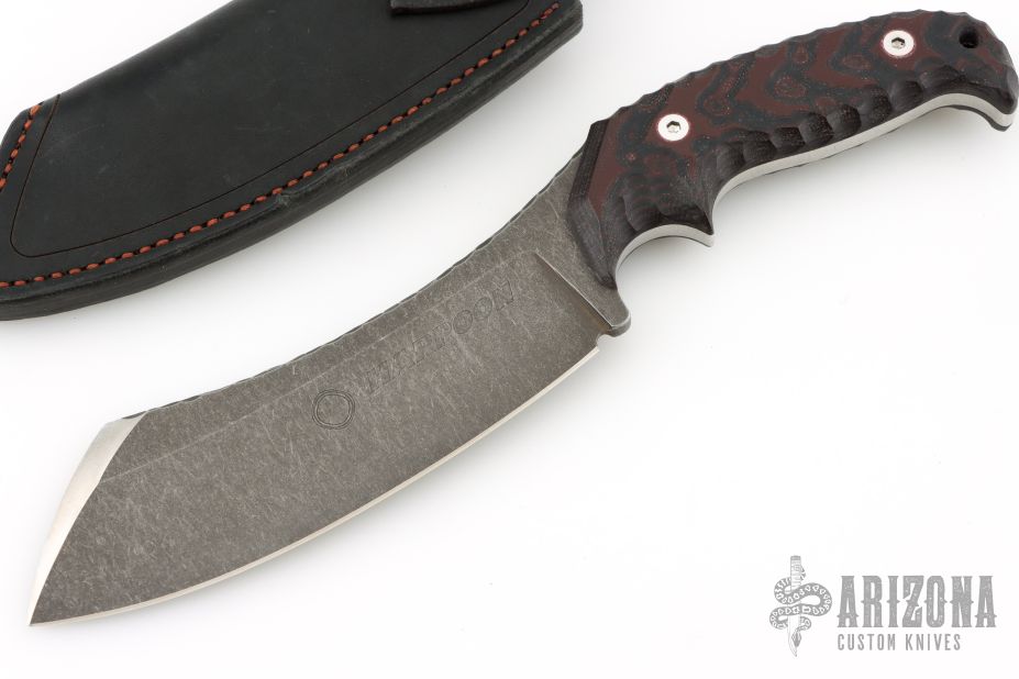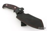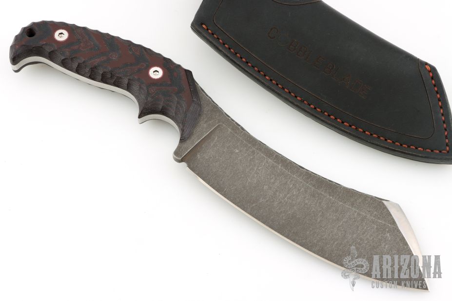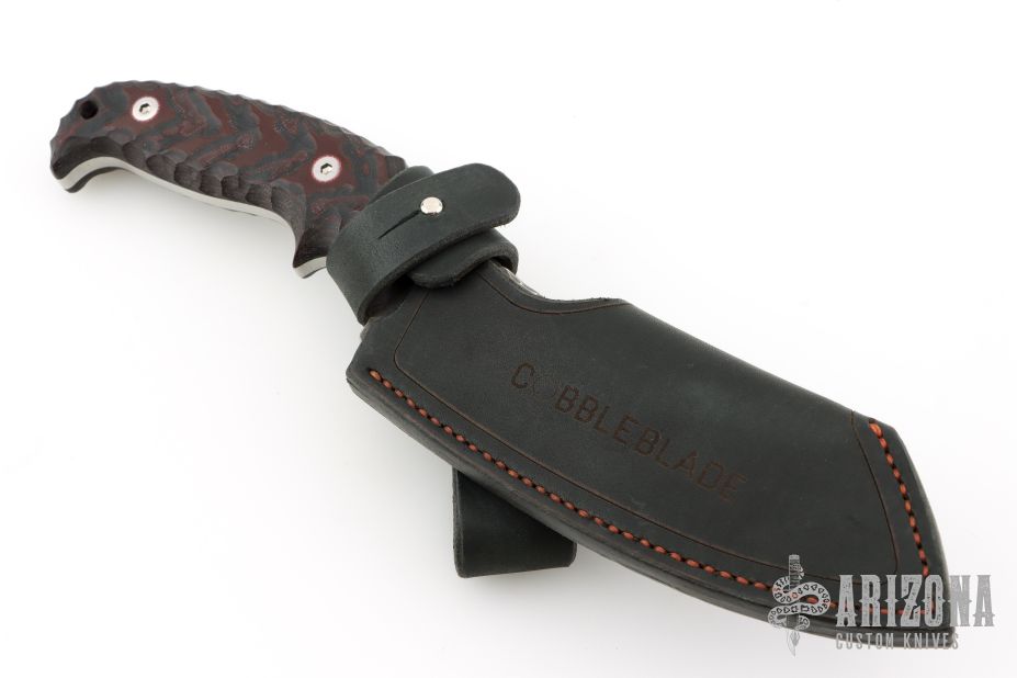 This Harpoon by Cobble Blade features a dark tumble finished blade with sharpened top edge and textured spine, .195" blade stock and 1.845" blade depth, full tang construction. The handle has textured black/red G-10 scales, lanyard hole at the butt, textured tang. Comes with a black leather sheath with belt loop. Comes with original box. Excellent condition.