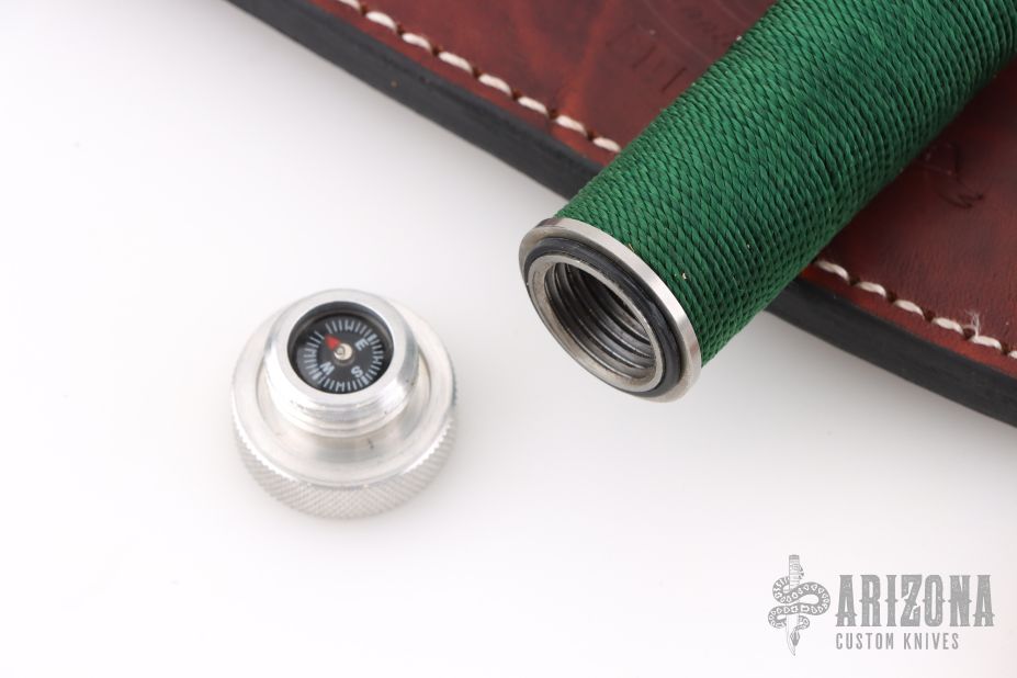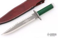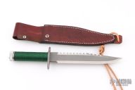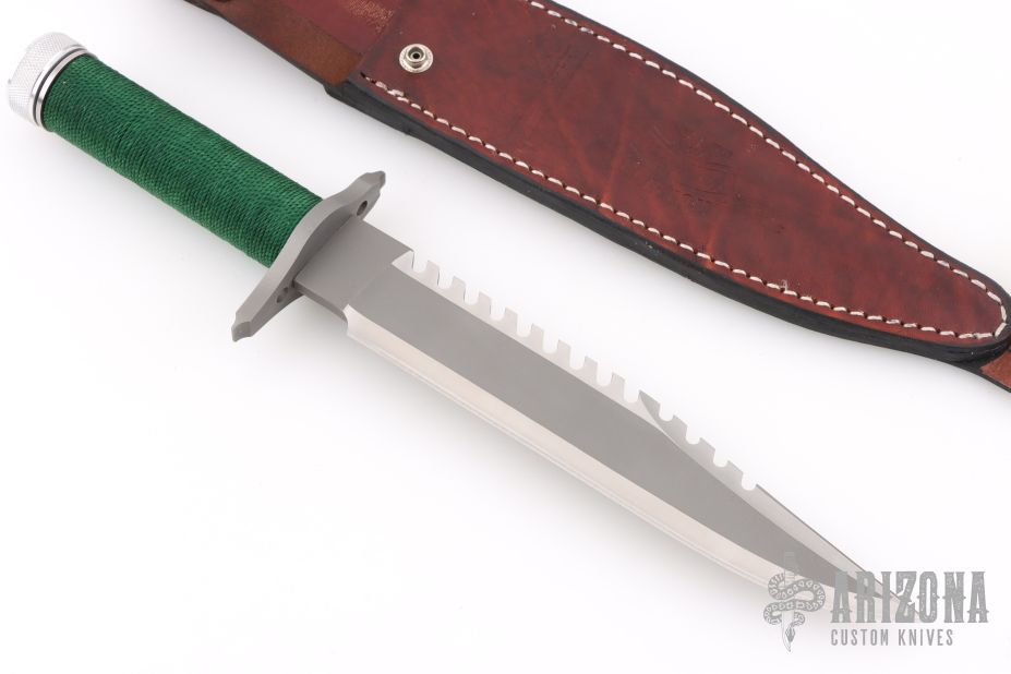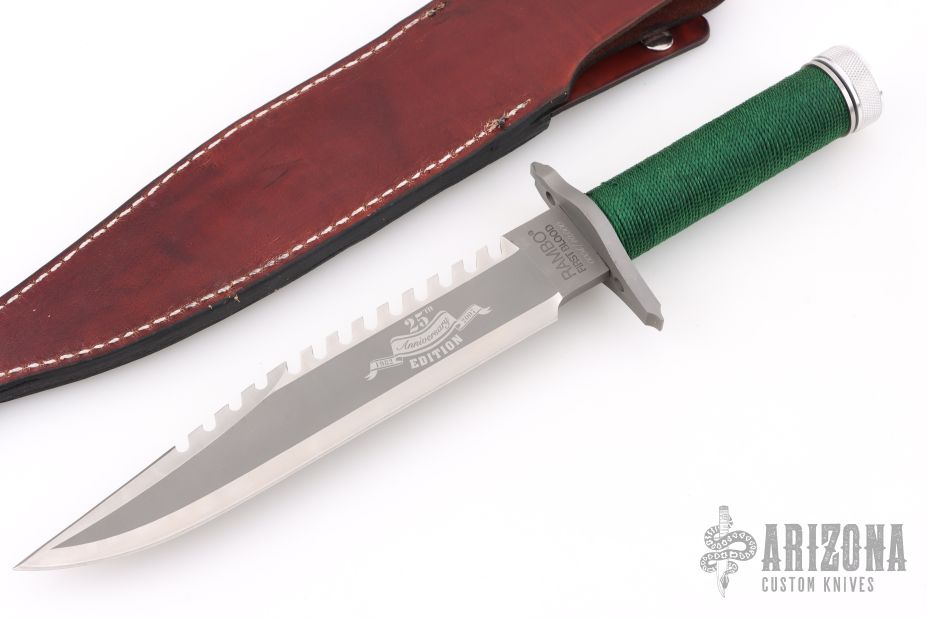This 25th Anniversary Edition Rambo First Blood by Master Cutlery and Hollywood Collectibles Group features a two tone blade with bead blasted center and satin finished grinds, serrated top edge and saw-teeth on blade spine, .233" blade stock and 1.505" blade depth, hidden tang construction. The handle has a bead blasted stainless steel double guard with flat and Phillips head screw drivers, hollow cord wrapped handle, and aluminum removable butt cap with compass and an O-ring to make it water-proof. Comes with original box, COA and brown leather sheath. Excellent condition. #4 of 10,000