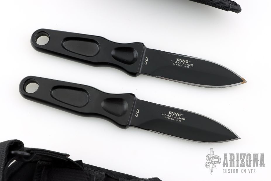 This Sting by CRKT is an AG Russell design, it features a forged 1050 carbon steel blade with integral handle, coated black, .165" blade stock at the ricasso and .900" blade depth, lanyard hole at the butt. Comes with original box, papers, and black nylon sheath with belt loop. Excellent condition.