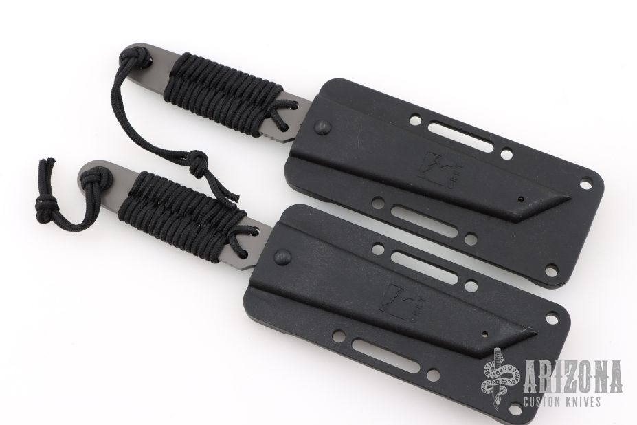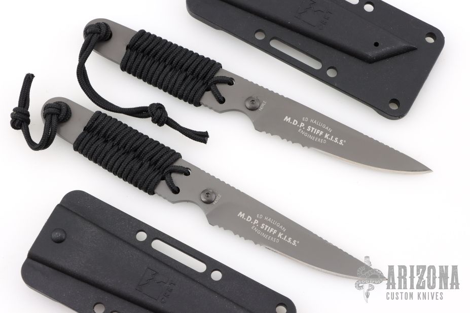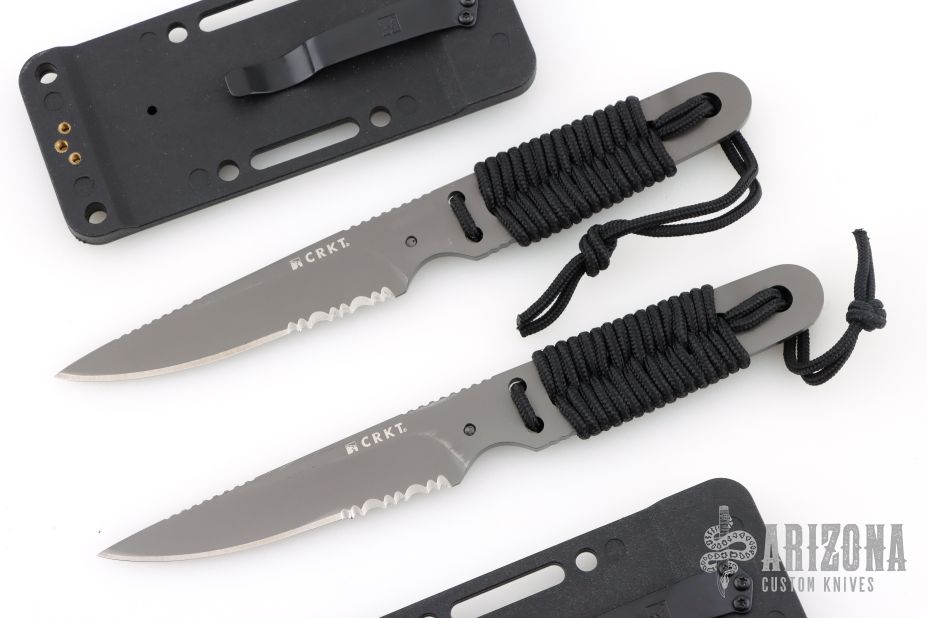 This CRKT K.I.S.S. knife has a gray serrated blade with notched thumb rest and cord wrapped handle. .116" blade stock, and .829" blade depth. Comes with original box, papers and sheath. Has a couple light scratches, excellent condition otherwise.