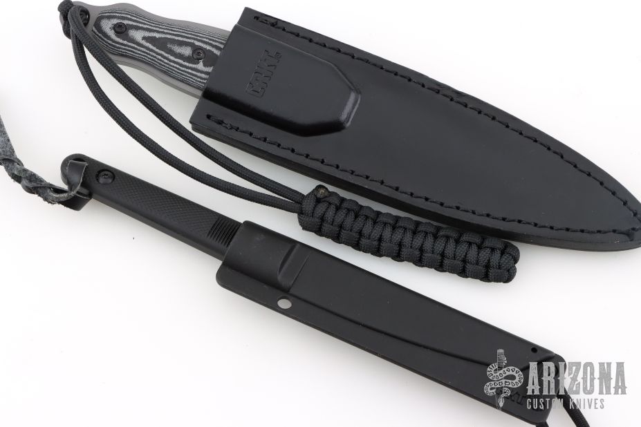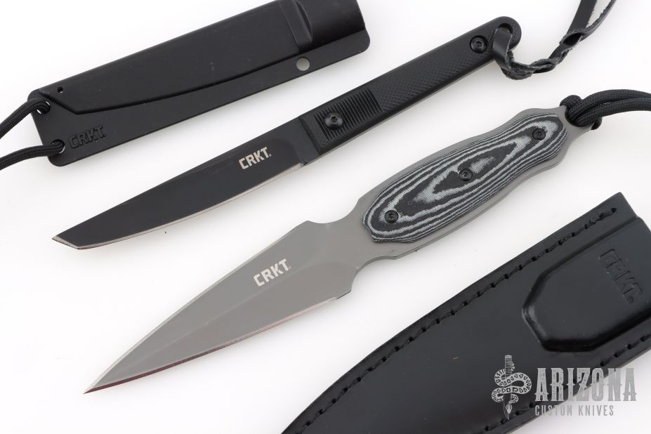 This CRKT Shrill knife has a gray dagger blade with micarta handle. .150" blade stock, and 1.274" blade depth. Comes with original box, papers and sheath. Has a couple light scratches, excellent condition otherwise. 4.25" blade length, 8.625" overall, weighs 4.2 oz.