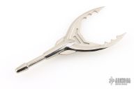 The spike has two serrated, unsharpened prongs that are 1.75" long, .327" wide, and .124" thick. The "handle" is 2.75" long and .451" thick at its widest. Integral nonferrous metallic construction.