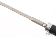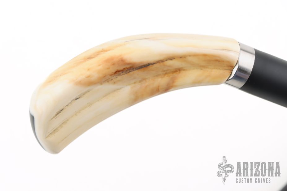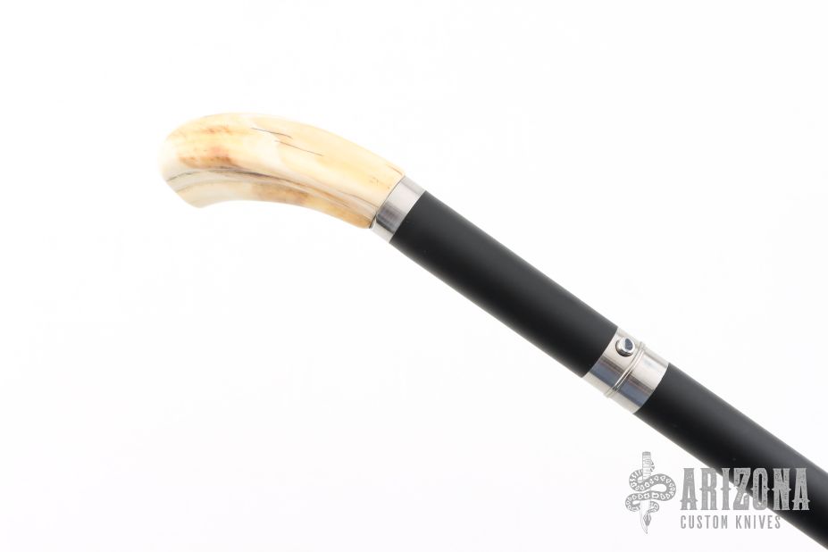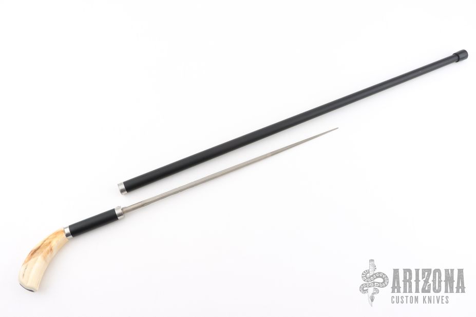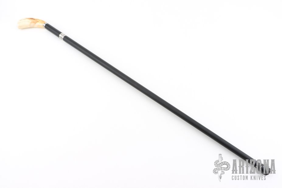 This sword cane by Burger Knives features a bead blasted square blade with fullers and filework, 16.75" blade with a satin finish, .280" blade stock. The handle is warthog tusk and a carbon fiber shaft. Overall length of the cane is 36". Comes with a cloth pouch. Has some scuffs, otherwise excellent condition.