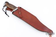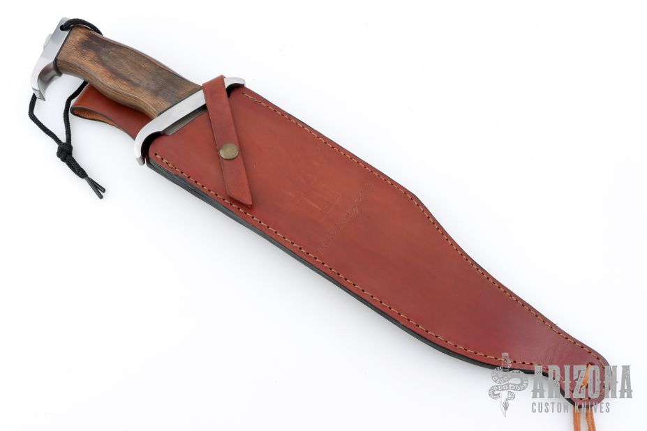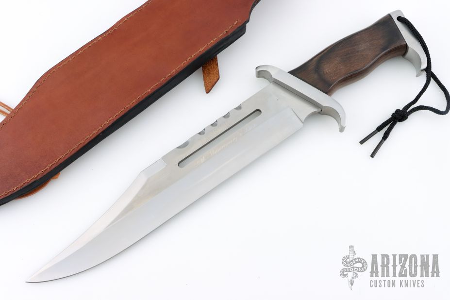 Hollywood Collectibles Group has recreated this historic knife in a strictly limited edition of just 10,000 pieces worldwide. Each knife measures an impressive 18" long and features its own individual serial number on the blade. This is the first time ever that a full size licensed factory reproduction of the actual knife used in the movie has been available. Knives offered previously were actually scaled down replicas, substantially smaller and lighter than the actual knife used by Sylvester Stallone in the movie. This museum quality replica has been hand crafted with pride from the finest materials available and comes complete with a top grain leather sheath.