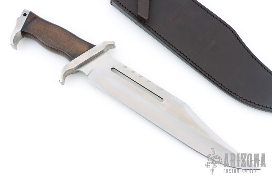 - Large custom bowie blade witth anti-glare sighting slot.