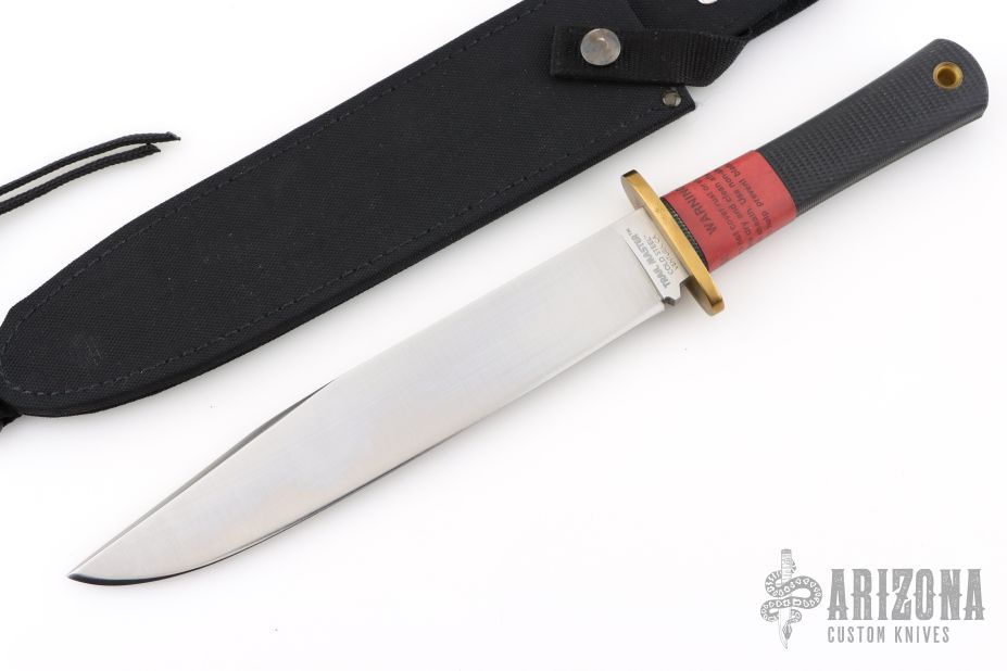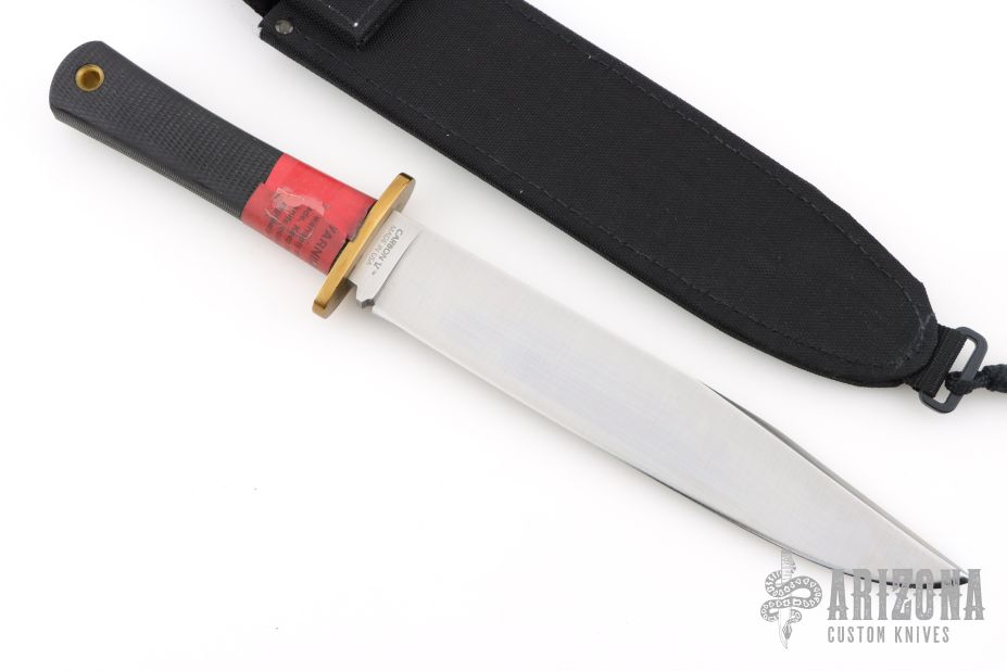 This Trail Master bowie by Cold Steel features a satin finished clip point blade with a false top edge, .306" blade stock and 1.482" blade depth, hidden tang construction. The handle has a brass guard and a rubber handle. Comes with the original box (beat up/broken), papers, and original black nylon sheath. Has a couple light scuffs/scratches, otherwise Excellent condition.