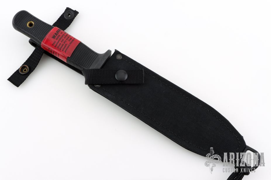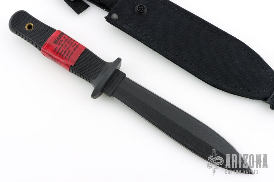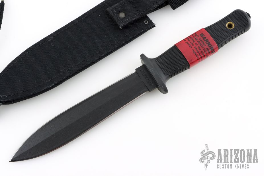 This Peacekeeper 1 from Cold Steel features a double edged black blade with .206" blade stock and 1.325" blade depth. The handle has a Kraton grip over hidden tang construction. Lanyard hole in pommel. Comes with original sheath. Has a couple light scuffs, otherwise Excellent condition.