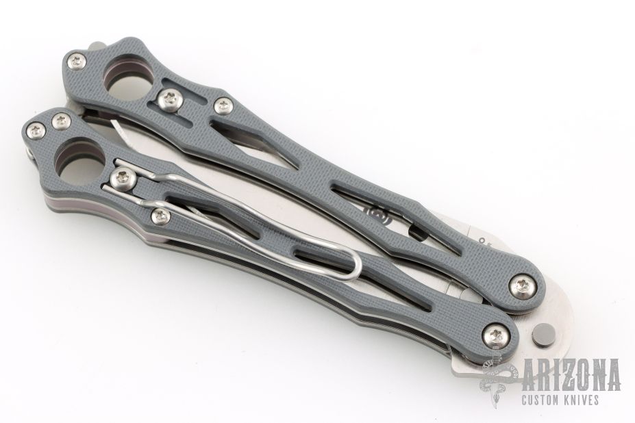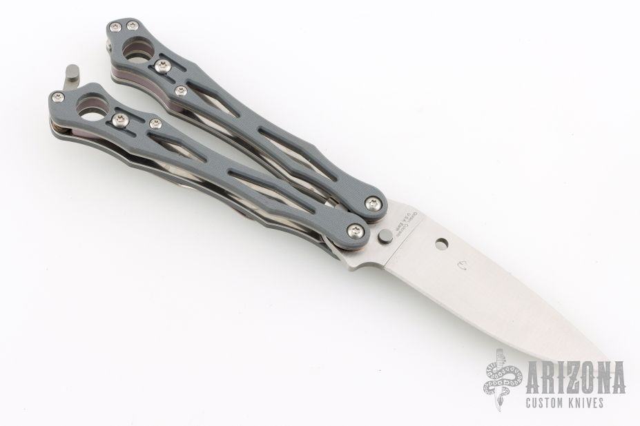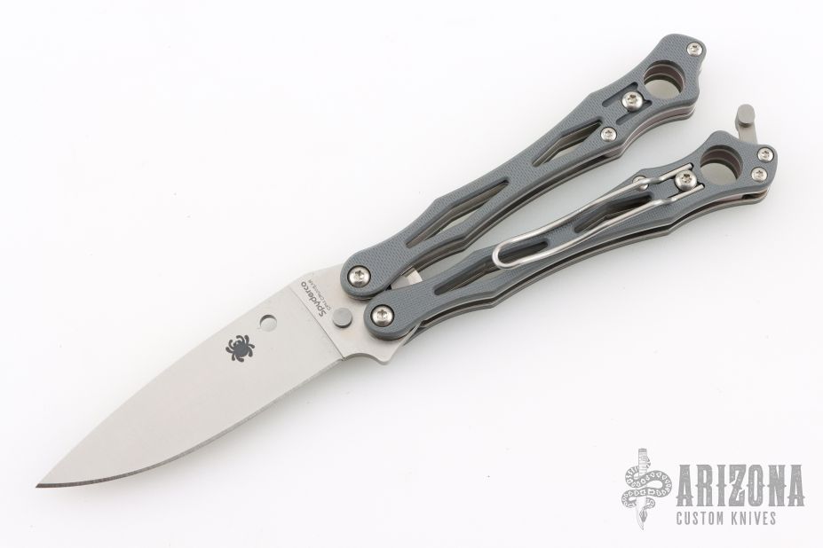 Spyderco's original SmallFly was a uniquely different "spin" on the balisong, or Filipino butterfly knife. Now this remarkable design is back with this special limited featuring full-flat-ground, drop-point blade profile crafted from CPM-Cru-Wear. Like the original, it features skeletonized twin handles with full stainless steel liners and peel-ply-textured Gray G-10 scales. The Round Holes at the butt end of both handles reflect Spyderco's iconic trademark and help achieve optimal balance for high-speed manipulation. A spring-loaded latch attached to the "free" handle secures the handles together in the closed position, while the removable wire pocket clip may be attached to either side of both handles as both a carry option and tactile index.