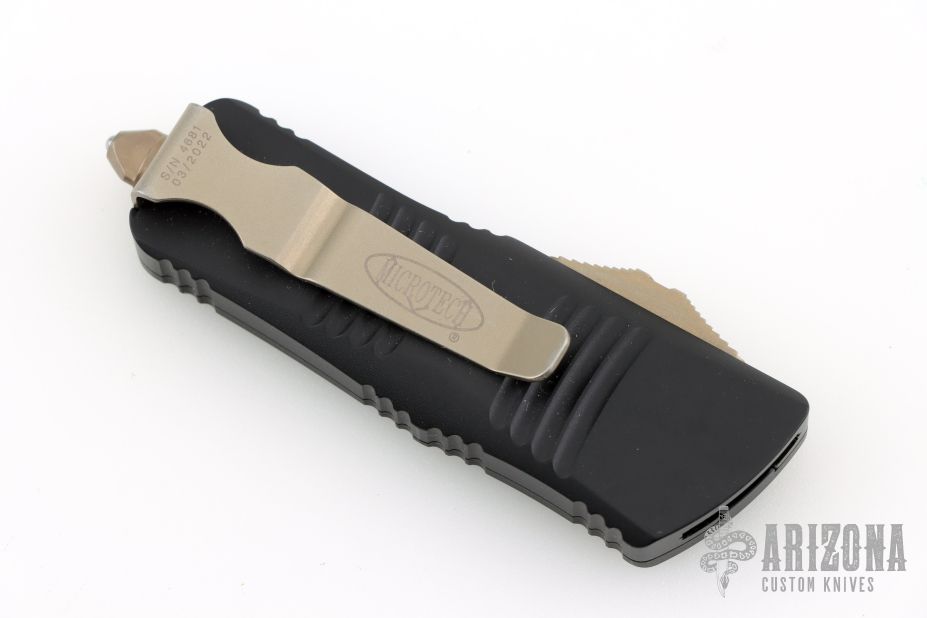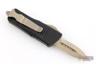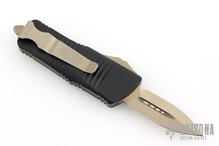 This Troodon Mini OTF automatic by Microtech knives features a bronzed finished double edged blade, and a black aluminum handle with bronzed hardware, tip down carry, thumbslide and glass breaker. S/N 4681. Dated 03/2022. Comes with original box and papers. Has a couple light scuffs on the clip, otherwise Excellent condition.