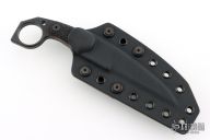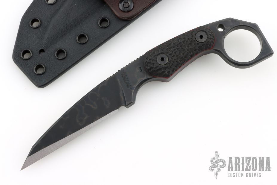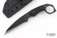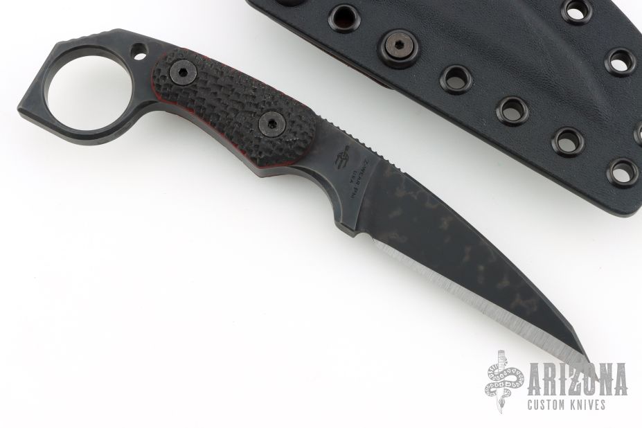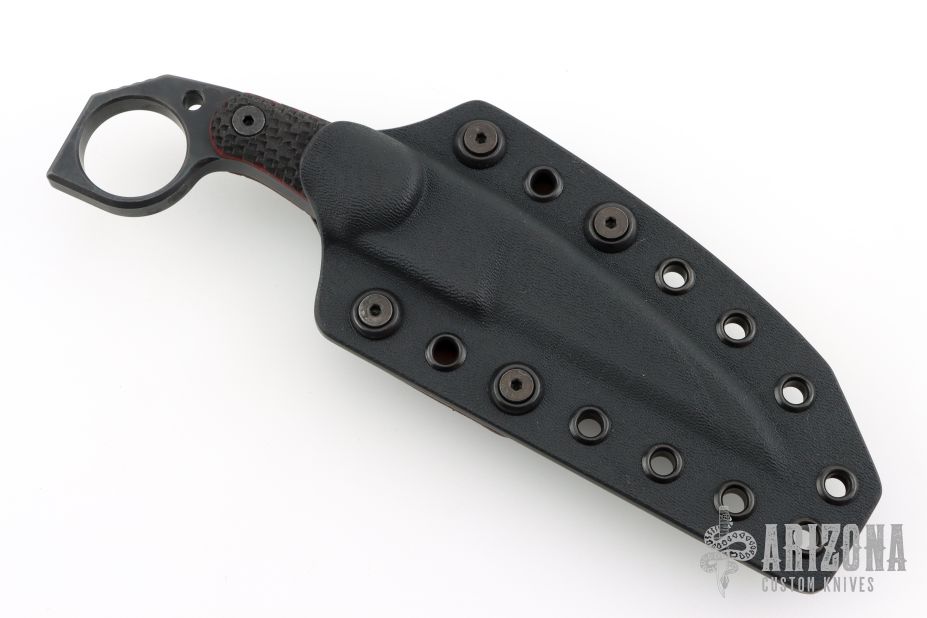 This M-5 Karambit from Miller Bros Blades features a coated wharncliffe style blade with notched thumbrest, .323" blade stock and .959" blade depth, full tang construction. The handle has textured black G-10 scales with red liners. Includes a kydex sheath with belt clip and COA dated 2025. New from maker.