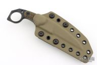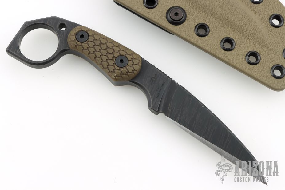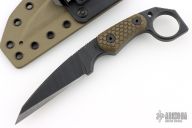 This M-5 Karambit from Miller Bros Blades features a coated wharncliffe style blade with notched thumbrest, .323" blade stock and .959" blade depth, full tang construction. The handle has textured green G-10 scales. Includes a kydex sheath with belt clip and COA dated 2025. New from maker.