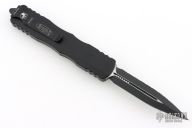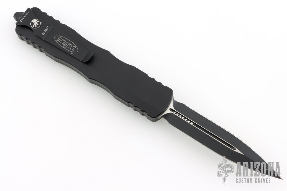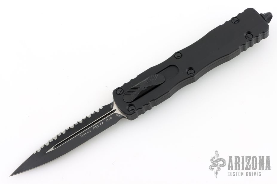This Dirac Delta OTF automatic by Microtech features a D/E DLC finished blade with a fully serrated edge. The handle is DLC aluminum with a stainless steel tip down clip. Serial number 8762 and dated 05/2023. Comes with original box and papers. Excellent condition.