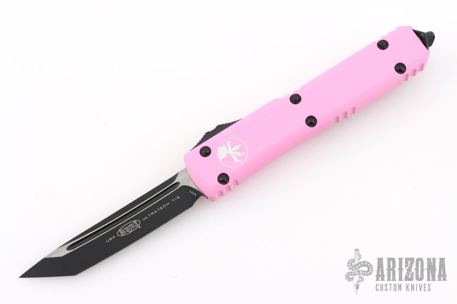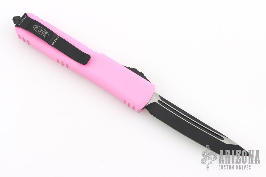 This Ultratech OTF automatic by Microtech features a T/E black tanto blade. Pink aluminum contoured frame with all black hardware and tip down stainless steel clip. Dated 08/2023 and s/n 287585. Excellent condition. Includes original box and papers.
