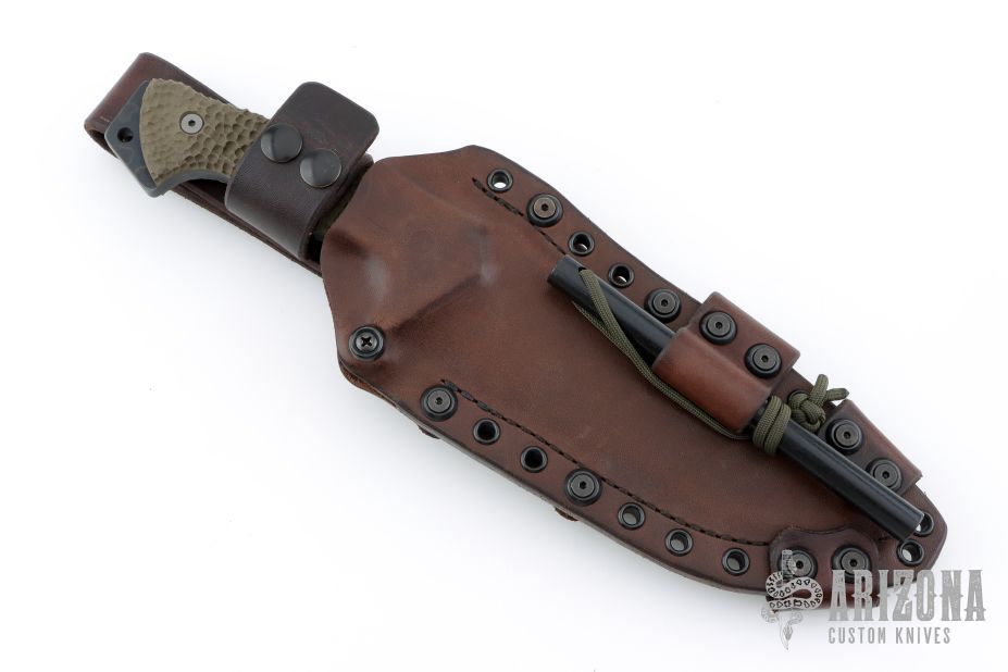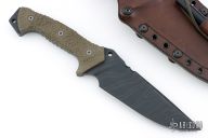 This M-29 by Miller Bros Blades features a coated drop point blade with a false top edge, made from Z-Wear PM steel, .283" blade stock 2.238" blade depth, full tang construction. The handle has textured green G-10 scales, notched tang, lanyard hole in extended tang. Comes with a leather sheath and COA dated 2025. New from maker.