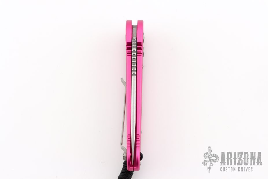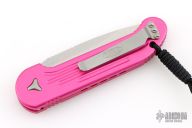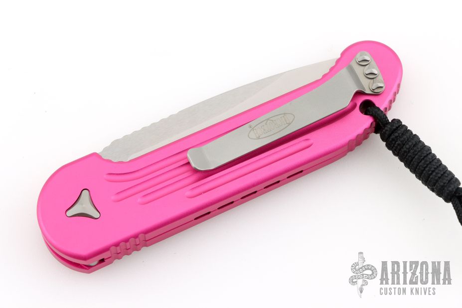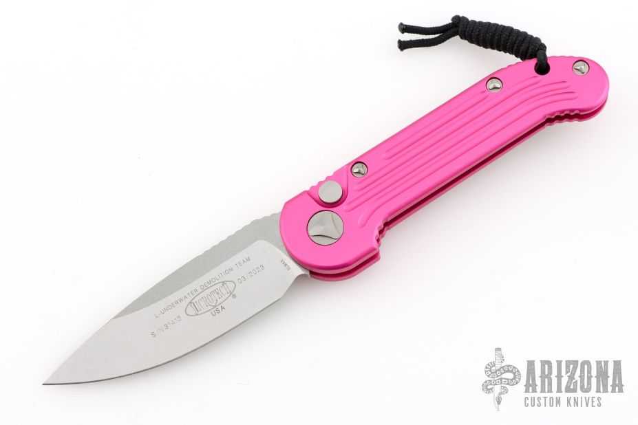 This LUDT side opening automatic by Microtech has a two-tone finished blade with a standard edge and a contoured pink aluminum frame. Matching stainless steel clip. Dated 03/2023 and serial number 31412. Comes with original box and papers. Excellent Condition.