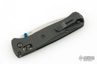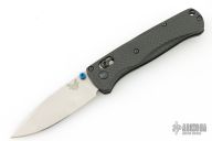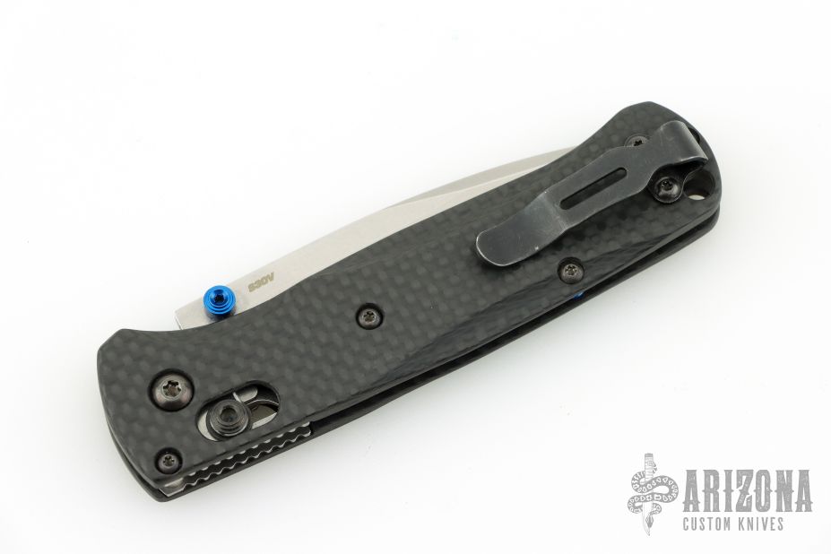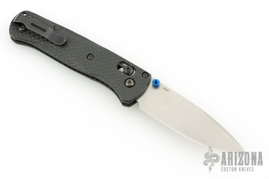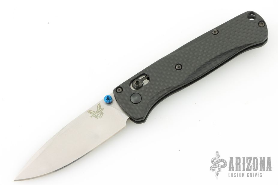 The 535 Bugout knife is built with a carbon fiber handle and a stonewash finished blade with a plain cutting edge.