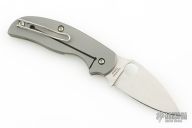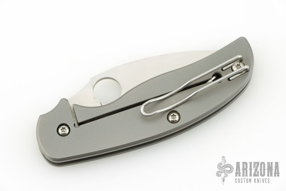 This Sage II by Spyderco has a satin finished blade with thumb hole and notched thumbrest. The handle has a bead blast finished titanium frame with tip up, right or left, stainless steel clip. Has light scuffs and scratches, otherwise good condition.