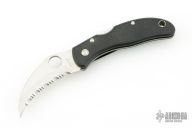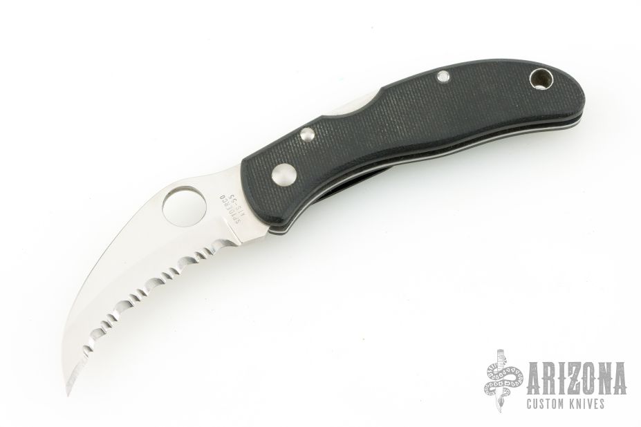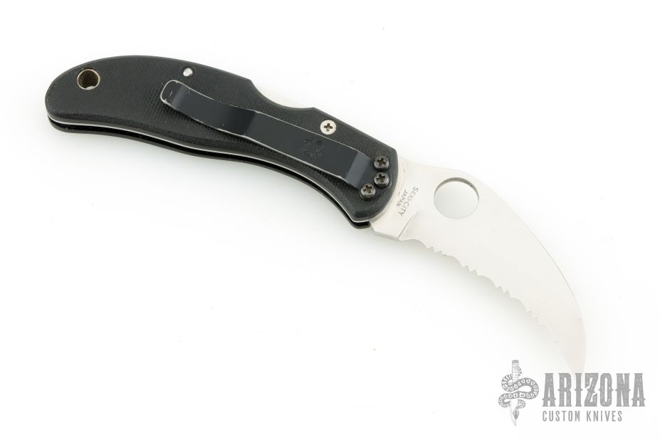 This C08GS Harpy by Spyderco features a full serrated hawkbill style blade with satin finish and thumbhole. The handle has black G-10 scales with lanyard tube over a single steel liner and steel backspacer. The steel clip is positioned for tip down, right hand carry. Has some wear on the clip, otherwise excellent condition.