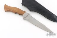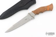 This Fighter by Sam Cox features a bead blast finished blade with top edge, a thumb ramp, .177" blade thickness and 1.359" blade depth, full tapered tang construction. The handle has dovetailed stainless steel bolsters, and pinned wood covers with an orange joint on the front scale. Includes a black leather sheath with belt loop. Has a couple light scuffs and scratches, great overall condition.