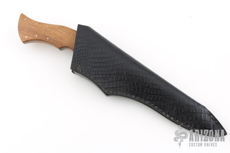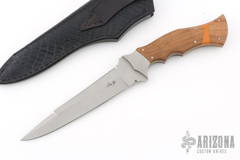 This Fighter by Sam Cox features a bead blast finished blade with top edge, a thumb ramp, .177" blade thickness and 1.359" blade depth, full tapered tang construction. The handle has dovetailed stainless steel bolsters, and pinned wood covers with an orange joint on the front scale. Includes a black leather sheath with belt loop. Has a couple light scuffs and scratches, great overall condition.