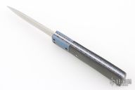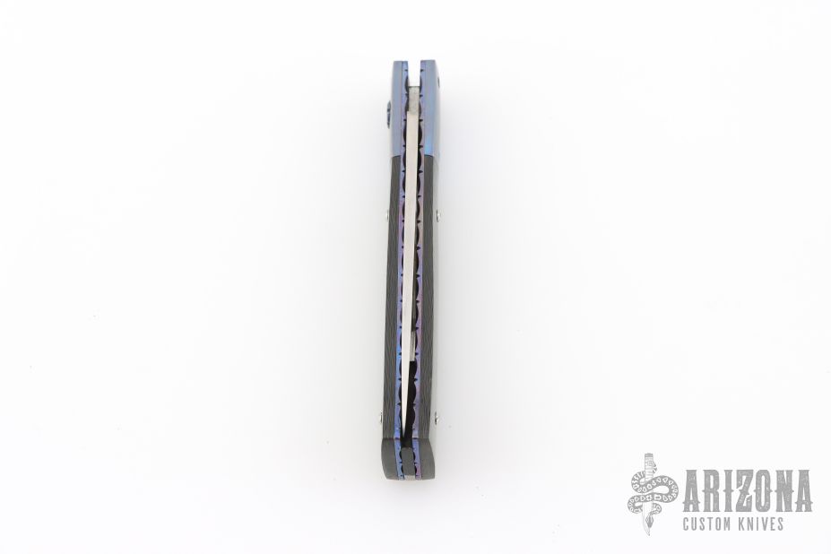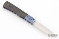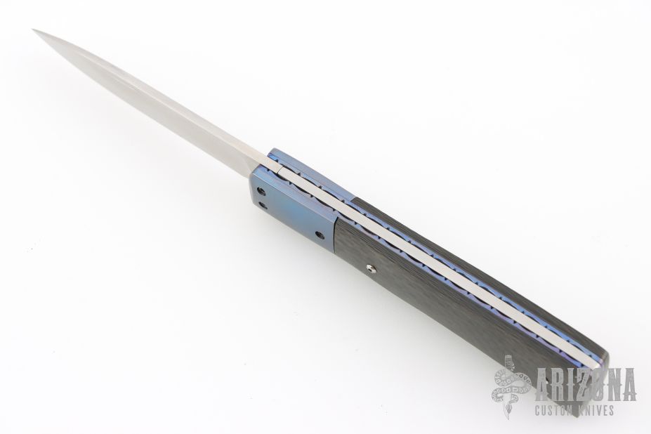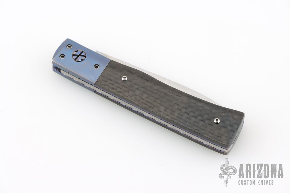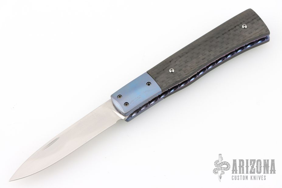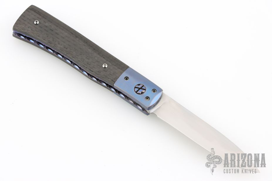 This slipjoint by Bill King features a hand rub satin finished blade with a nail nick. The handle has anodized titanium dovetailed bolsters, anodized and fileworked titanium liners with jeweled interiors, carbon fiber covers, stainless steel spring. Has some light scratches, otherwise excellent condition. Comes with original felt pouch.