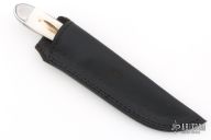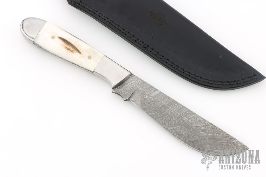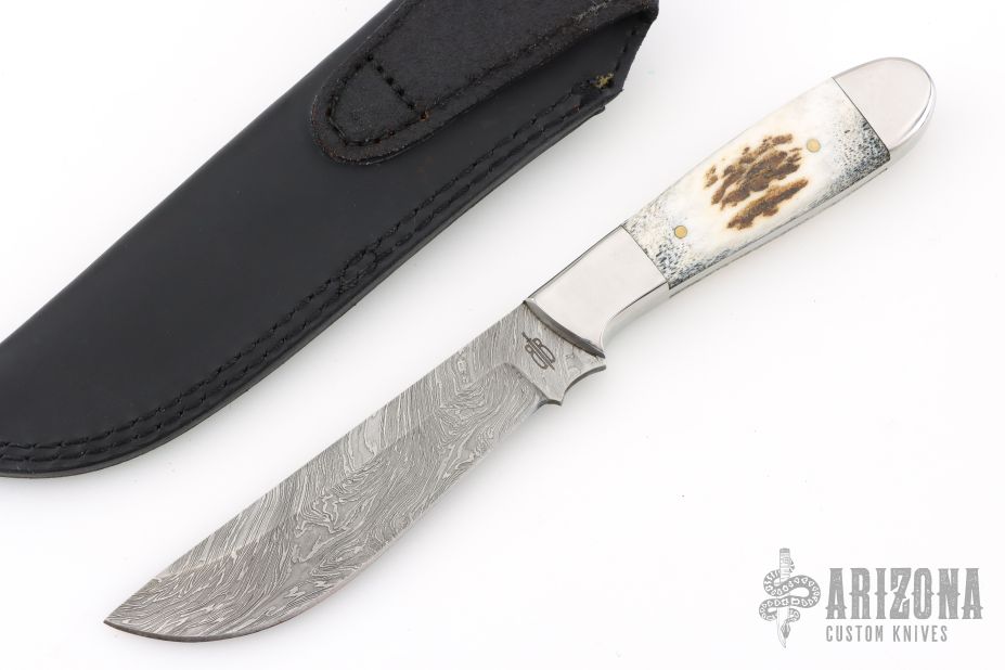 This knife by Buck and Bear features a Damascus blade with .163" blade stock and 1.115" blade depth, full tang construction. The handle has polished stainless steel front/rear bolsters, and pinned stag covers. Comes with original black leather sheath. Has a couple light scratches, excellent condition otherwise.