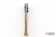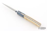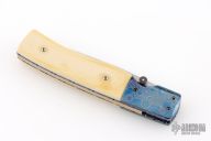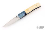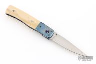 This linerlock folder by Bill King features a hand rub satin finished blade with a single thumbstud. The handle has dovetailed Blue Raindrop Damascus bolsters, mammoth ivory scales, fileworked and anodized titanium liners with jeweled interiors, mammoth ivory backspacer. Nice detent, lockup and blade is seating. #0229 on the blade. Excellent condition. Comes with original felt pouch.