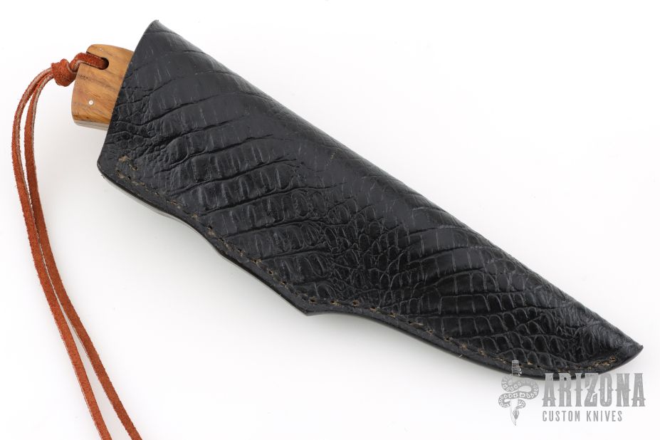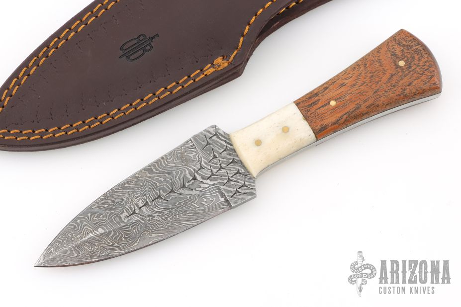 This knife by Buck and Bear features a Damascus dagger blade, .169" blade stock and 1.45" blade depth, full tang construction. The handle has wood scales, bone bolsters, with brass pins. Comes with a brown leather sheath. Excellent condition.