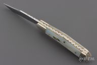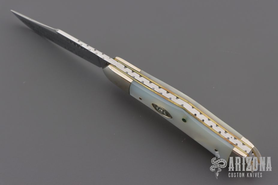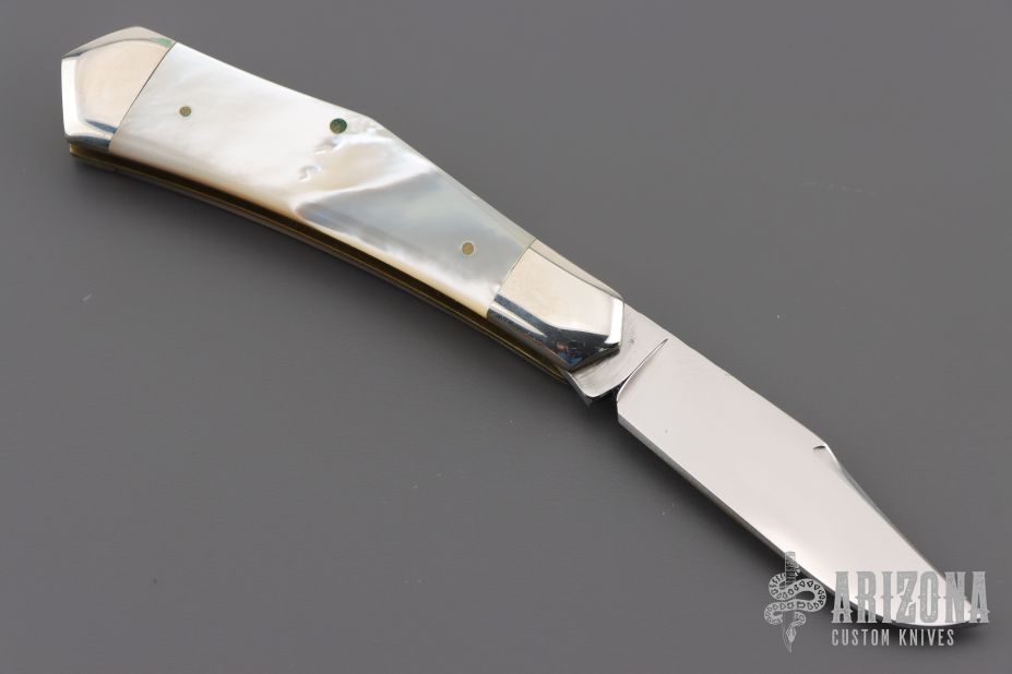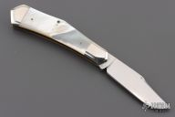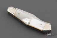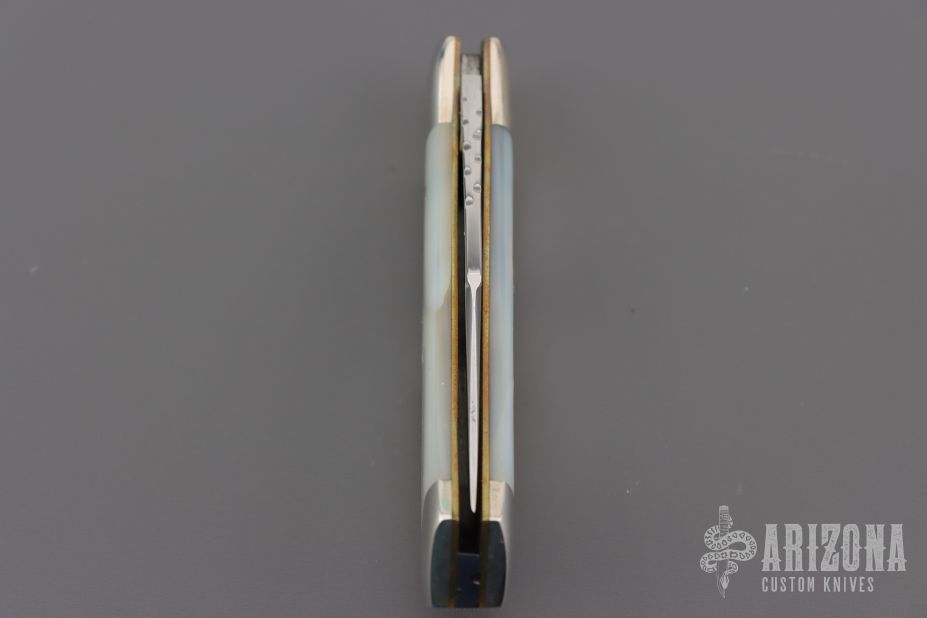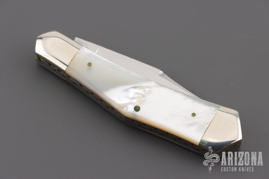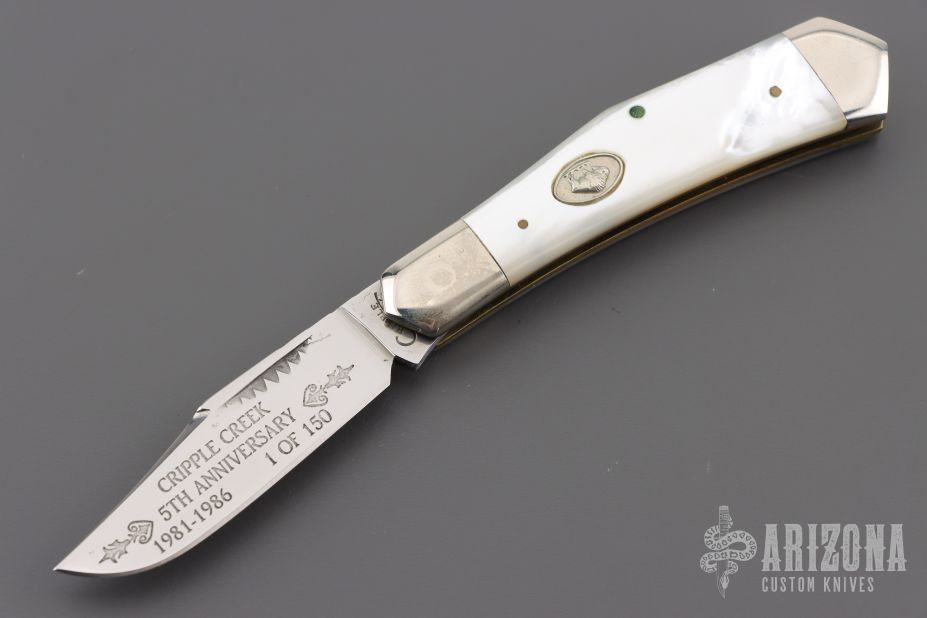This slipjoint by Cripple Creek has a mirror polished blade with nail nick and fileworked spine. The handle has nickel silver bolsters, mother of pearl covers, brass liners, fileworked stainless steel spring. 5th Anniversary 1981-1986 One of 150. Excellent condition. Comes with a leather pouch.