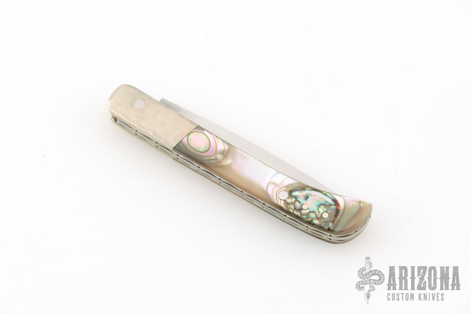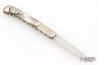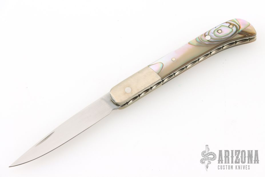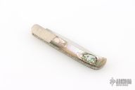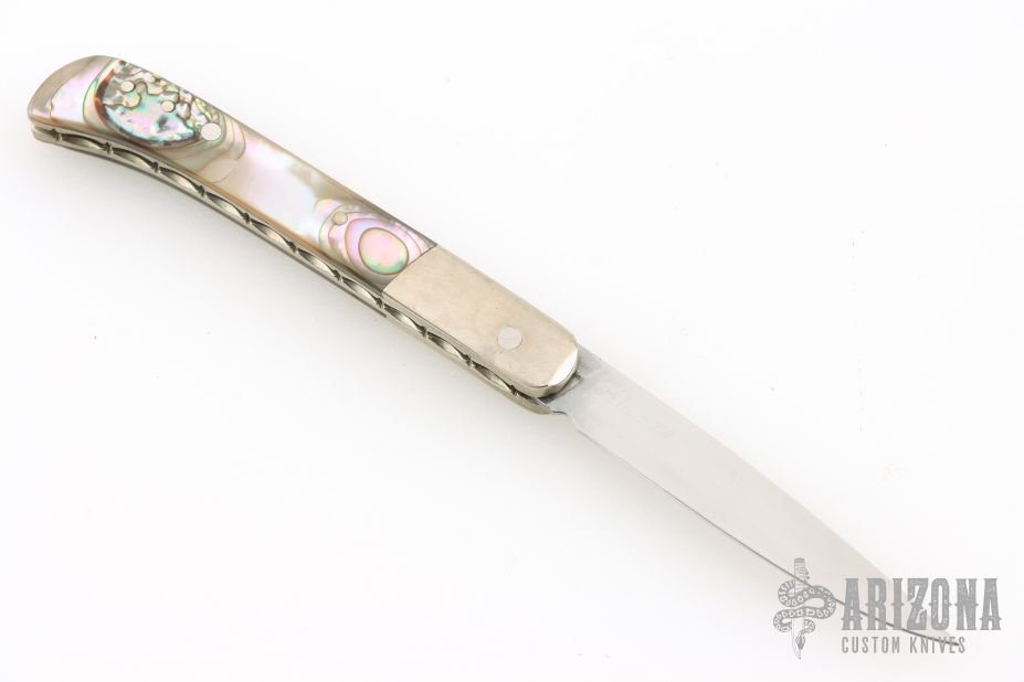 This slipjoint by Bill King features a hand rub satin finished blade with a nail nick. The handle has jeweled and dovetailed nickel silver bolsters, abalone covers, fileworked nickel silver liners, stainless steel backspacer. Excellent condition. Comes with original felt pouch.