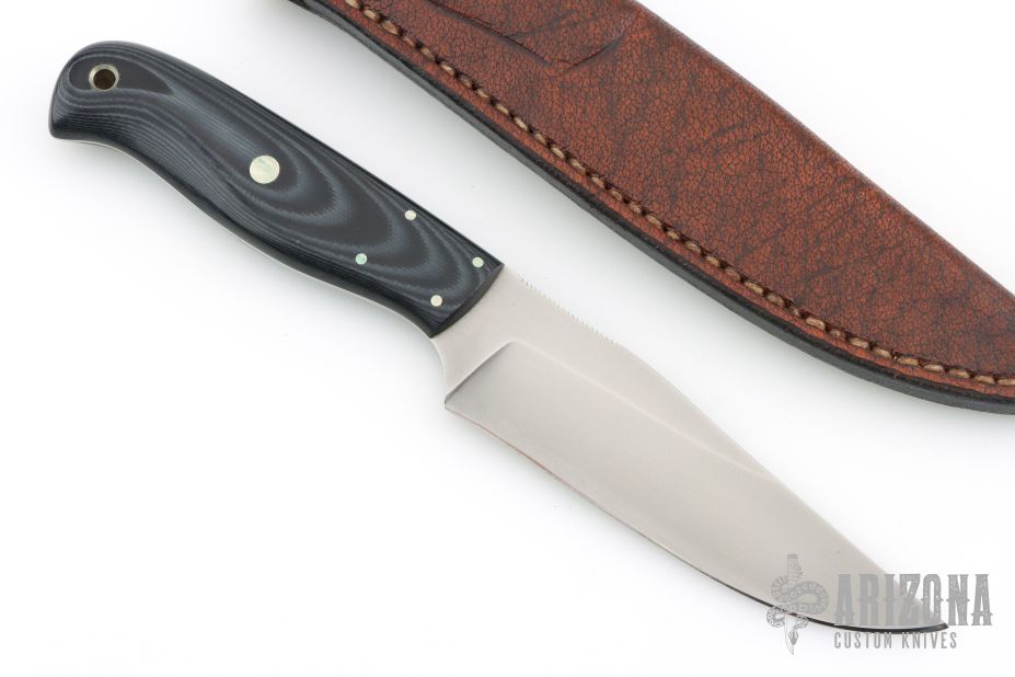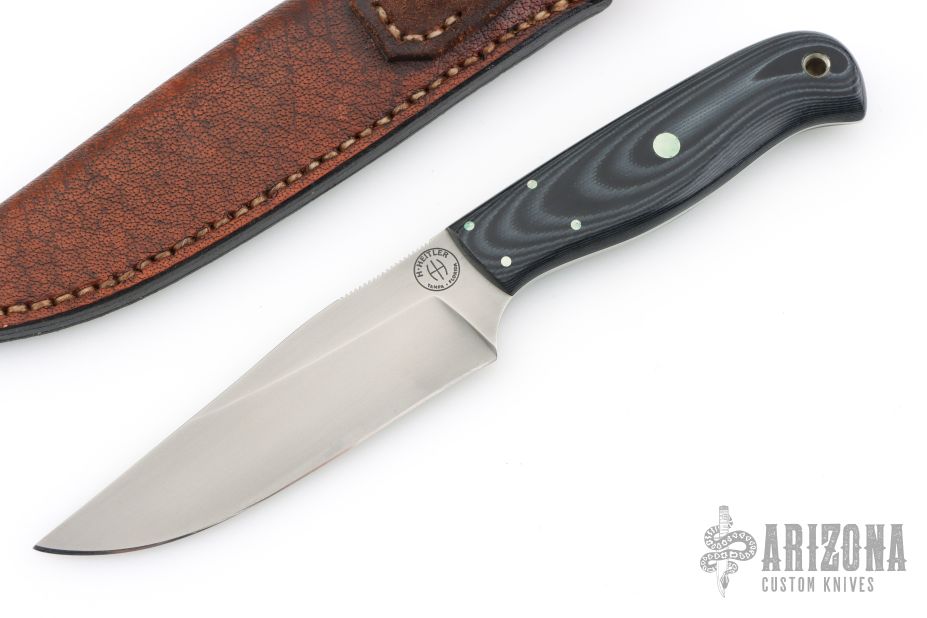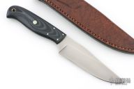 This Hunter by H Heitler features a bead blast finished blade with notched thumbrest, .131" blade stock and 1.291" blade depth, full tapered tang construction. The handle has black/grey G-10 scales with nickel silver pins and lanyard hole. Comes with a brown leather sheath with belt loop. Excellent condition.