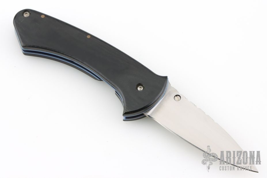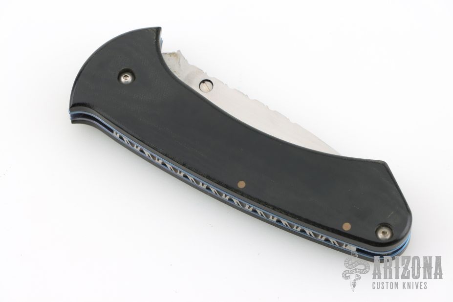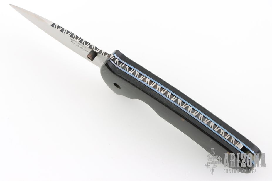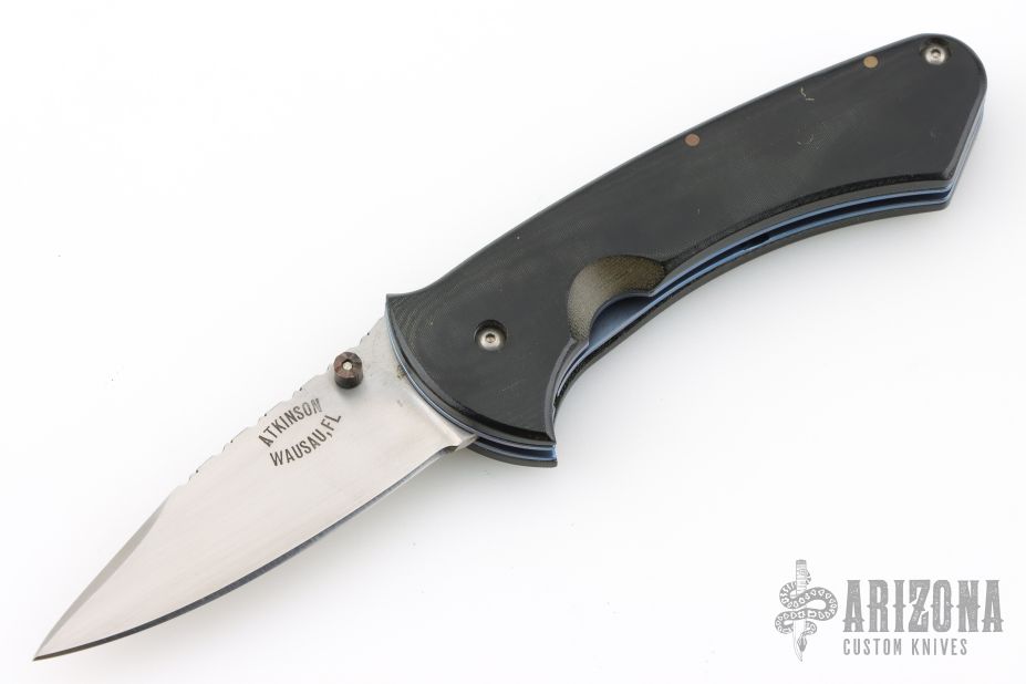 This linerlock folder by Dick Atkinson features a hand rub satin finished blade with single thumbstud and fileworked spine. The handle has black linen micarta scales, anodized titanium liners, fileworked stainless steel backspacer. Nice nice detent, blade seating and lockup. Excellent condition. Comes with a zippered case.