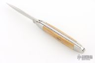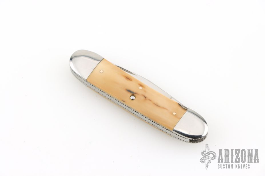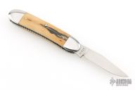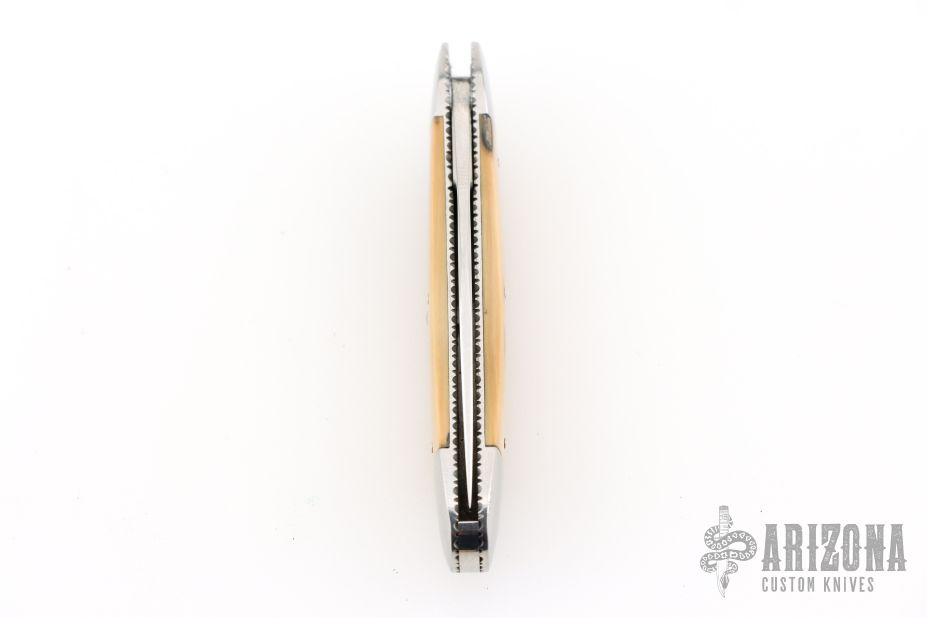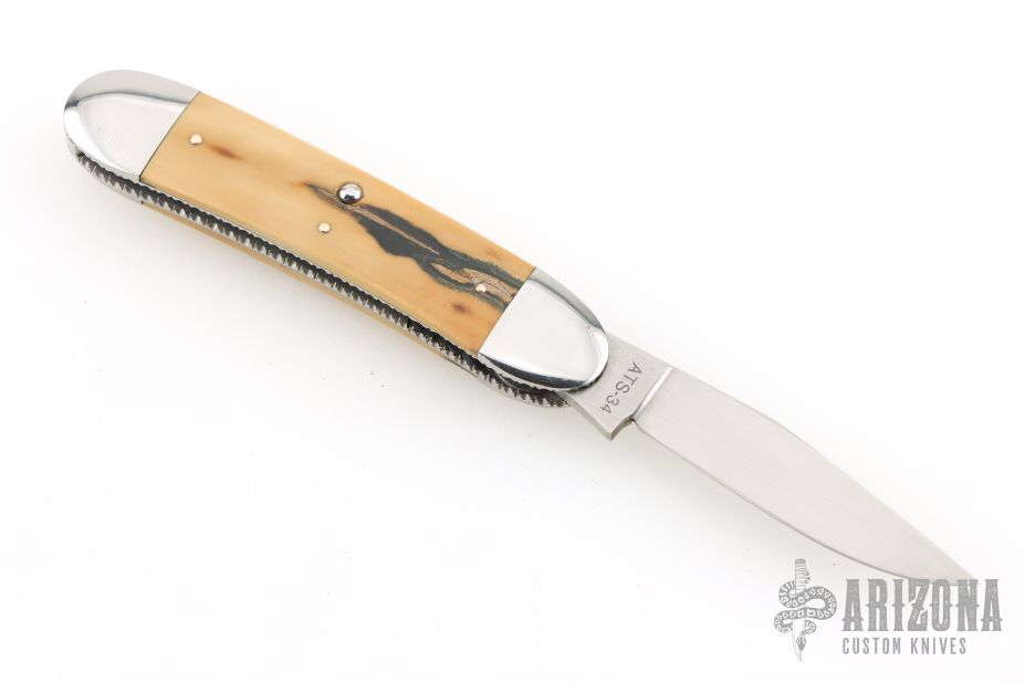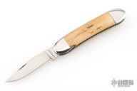 This slipjoint by Jack Davenport features a hand rub satin finished blade with nail nick. The handle has stainless steel bolsters, fileworked stainless steel liners , mammoth ivory covers, stainless steel spring. Comes with a zippered case. Has a couple light scratches, otherwise excellent condition.
