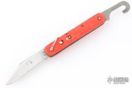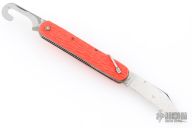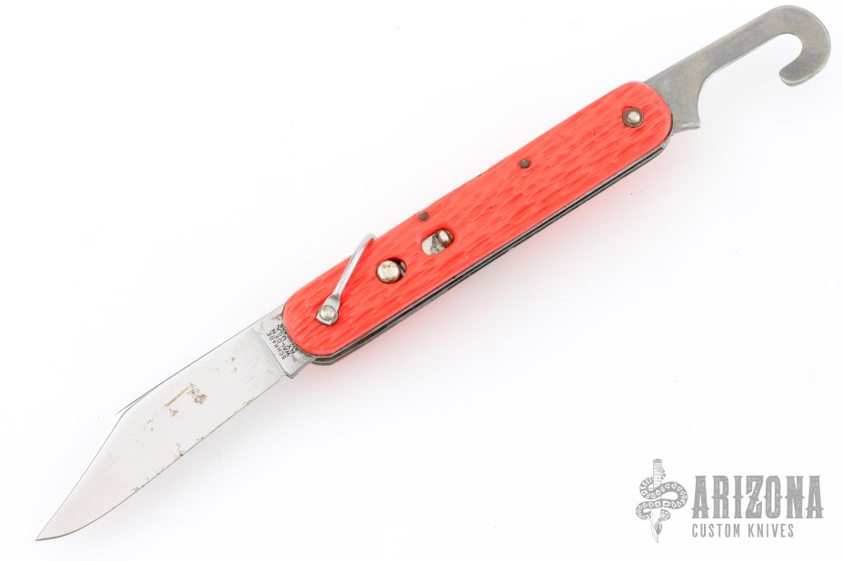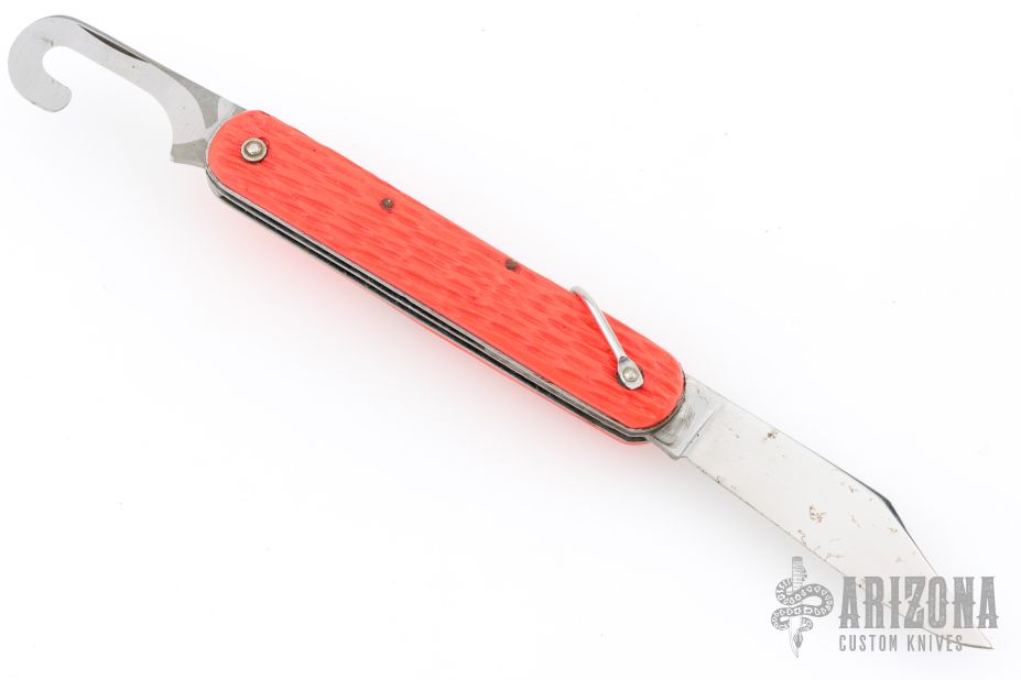 This knife by Camillus features a clip point blade. The handle has orange jigged scales, stainless steel liners and backspacer. Has some light scratches, some rust, and blade play, otherwise great condition.