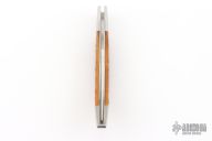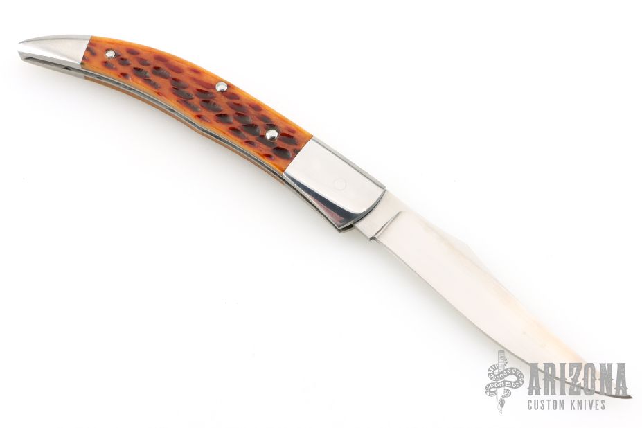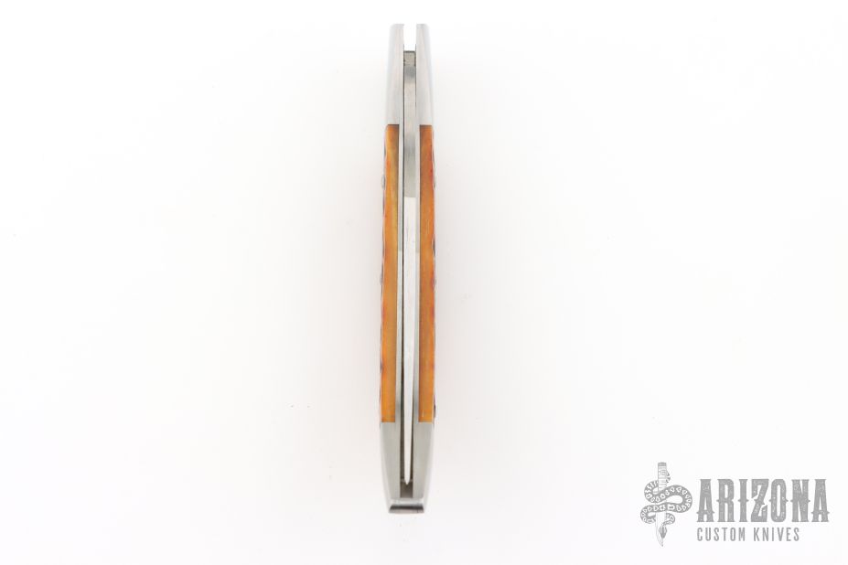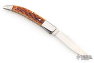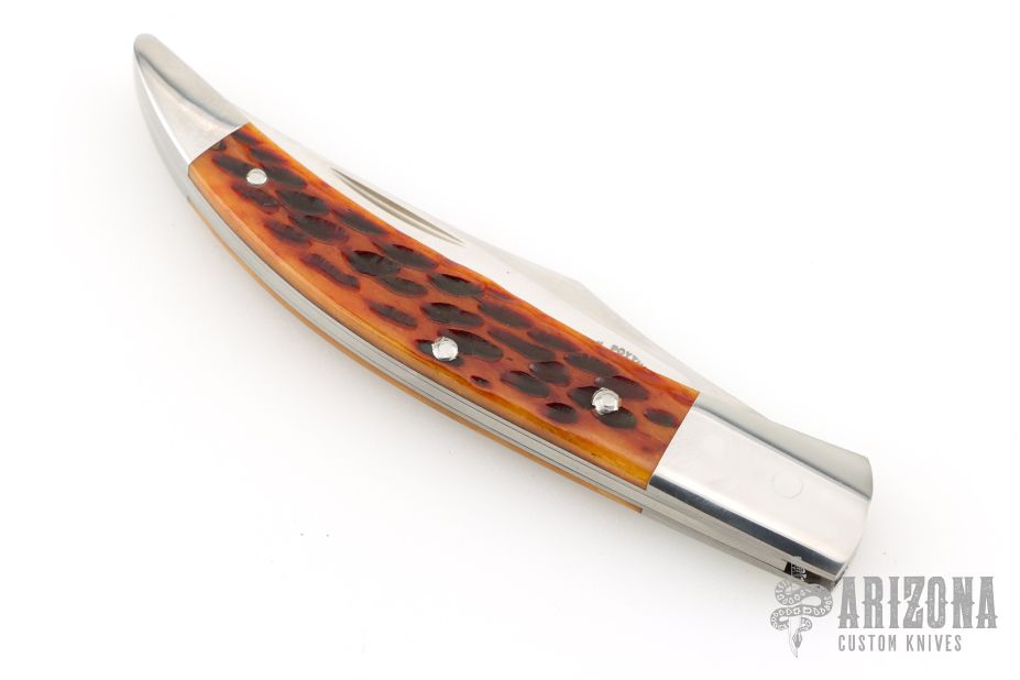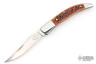 This slipjoint by John Poythress features a hand rub satin finished blade with nail nick. The handle has stainless bolsters and liners, stainless spring, and jigged bone covers with stainless pins. Has half-stop, flush in all positions. Has a few very light scratches, otherwise excellent condition. Comes with a zippered case.