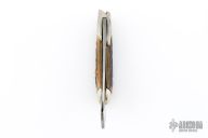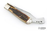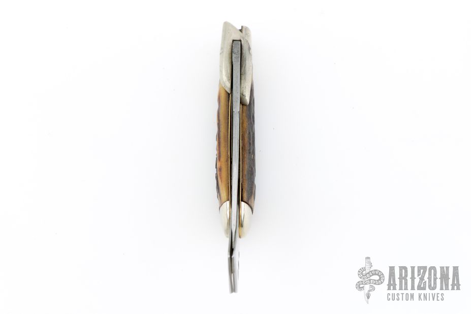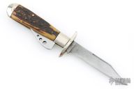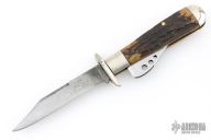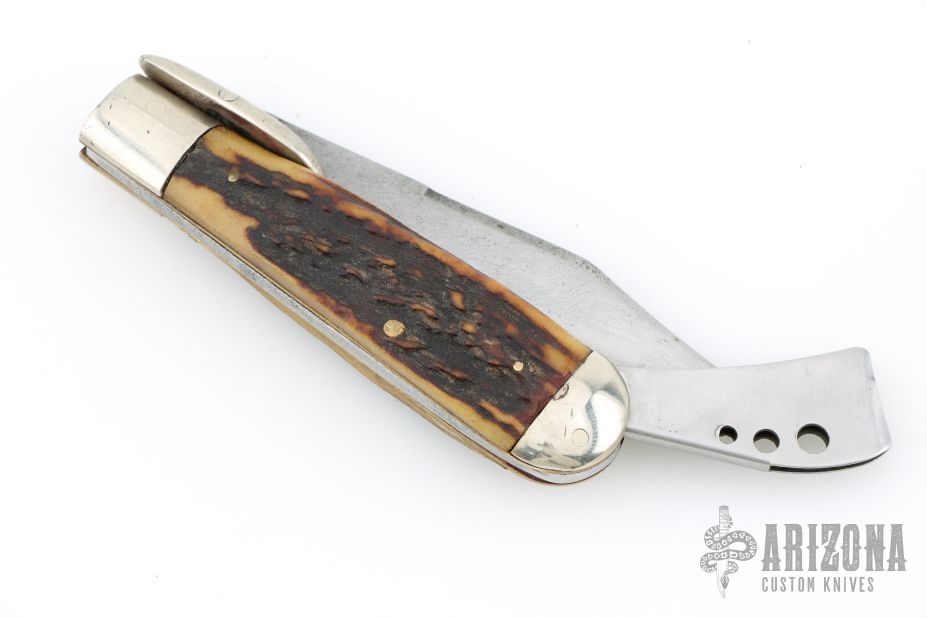 Unique design of the Marbles Safety knife makes this an intriguing piece. It has a satin finished blade, nickel silver swing guard and bolsters, brass liners and steel spring and blade cover. Pinned stag covers. Has scuffs, scratches, and patina. Comes in a COAST leather belt sheath. Good condition for its age and otherwise.