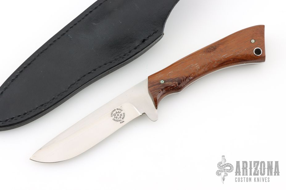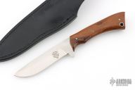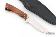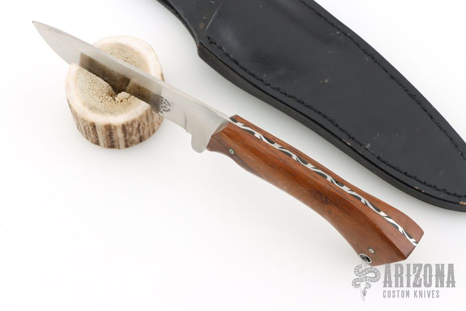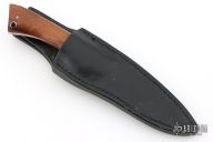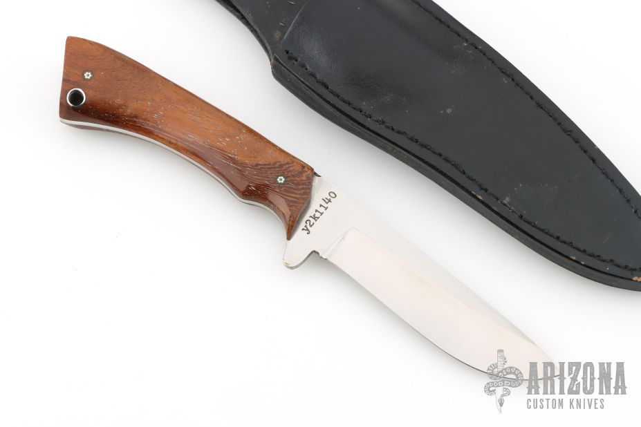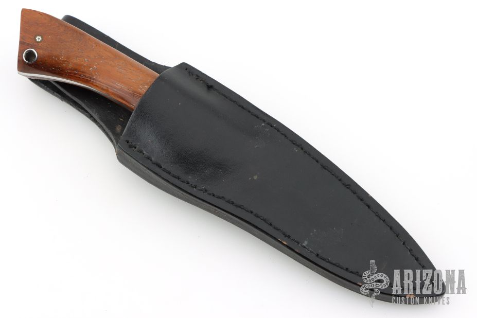 This knife by Dan Mink features a satin finished blade with .092" blade stock and .912" blade depth, full tang construction. The handle has wood scales with mosaic pins and a lanyard hole, fileworked tang spine. Comes with a black leather sheath. "y2k1140" on the blade. Has a couple light scratches, otherwise excellent condition.