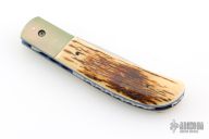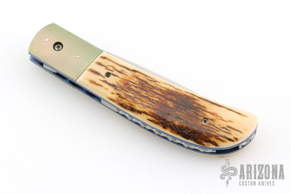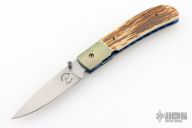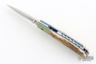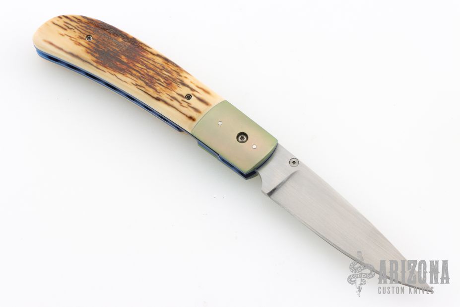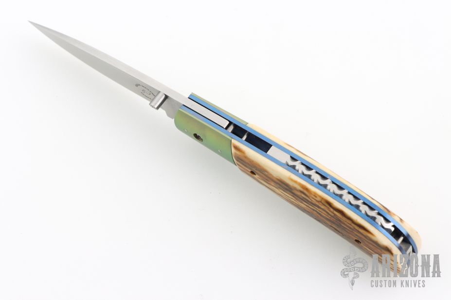 This linerlock by Reese Weiland features a hand rub satin finished blade with a single thumbstud. The handle has dovetailed and anodized titanium bolsters, mammoth ivory scales, anodized titanium liners with jeweled interiors, fileworked stainless steel backspacer. Nice blade seating, detent and lockup. Comes with a zippered case. Has a couple light scratches, otherwise excellent condition.
