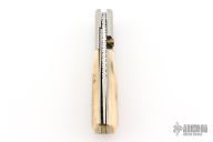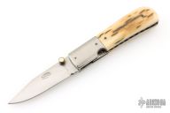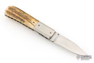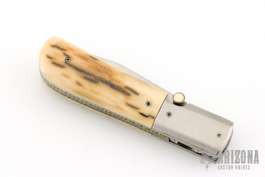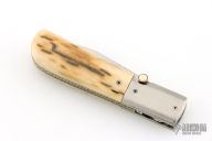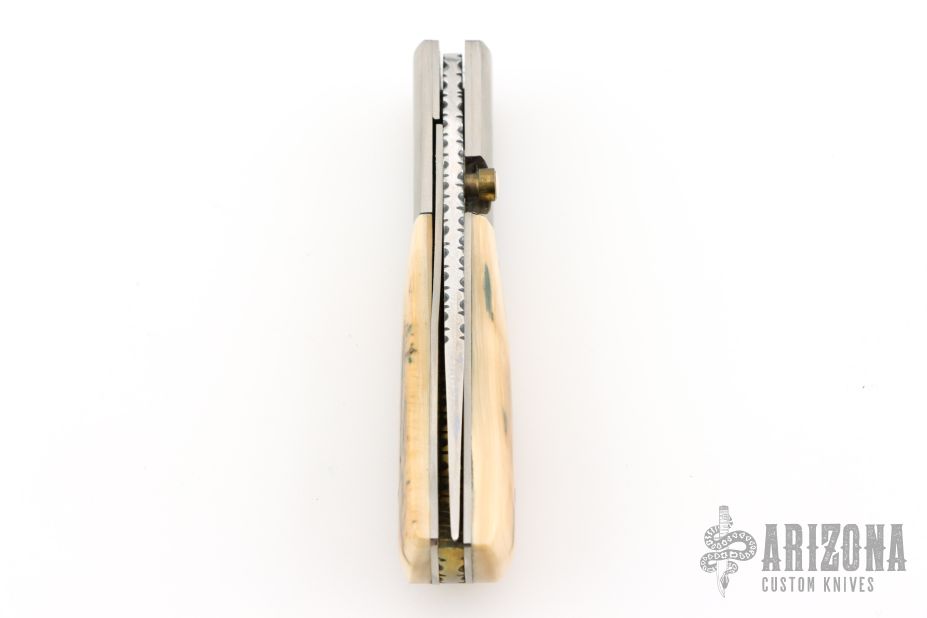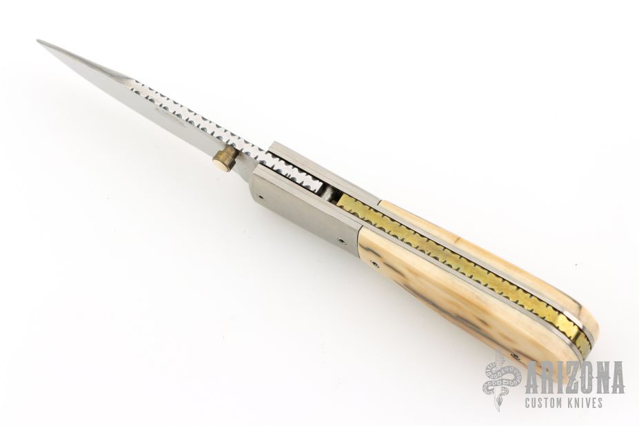 This knife by Bob Levine features a hand rub satin finished blade with a single thumbstud with mammoth ivory inlay, fileworked blade spine. The handle has titanium bolsters, mammoth ivory scales, titanium liners with jeweled interiors, fileworked anodized titanium backspacer. Has some light scratches, otherwise excellent condition. Comes with a zippered case.