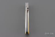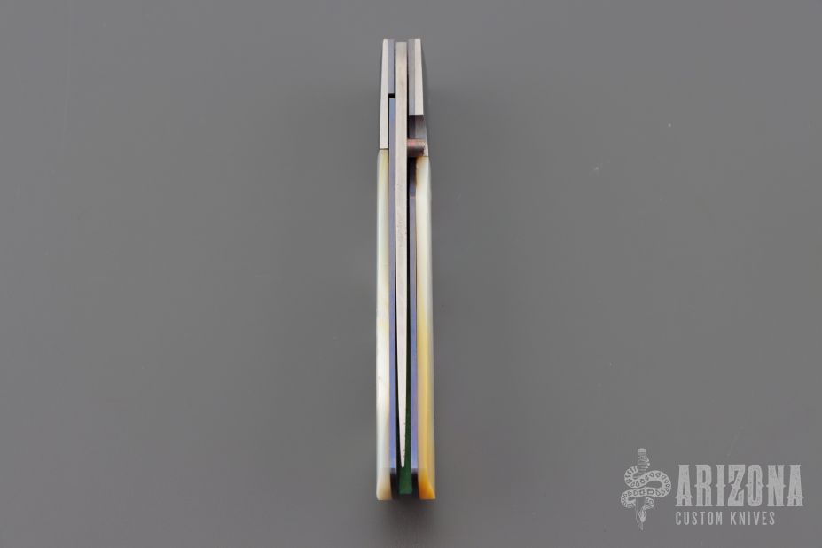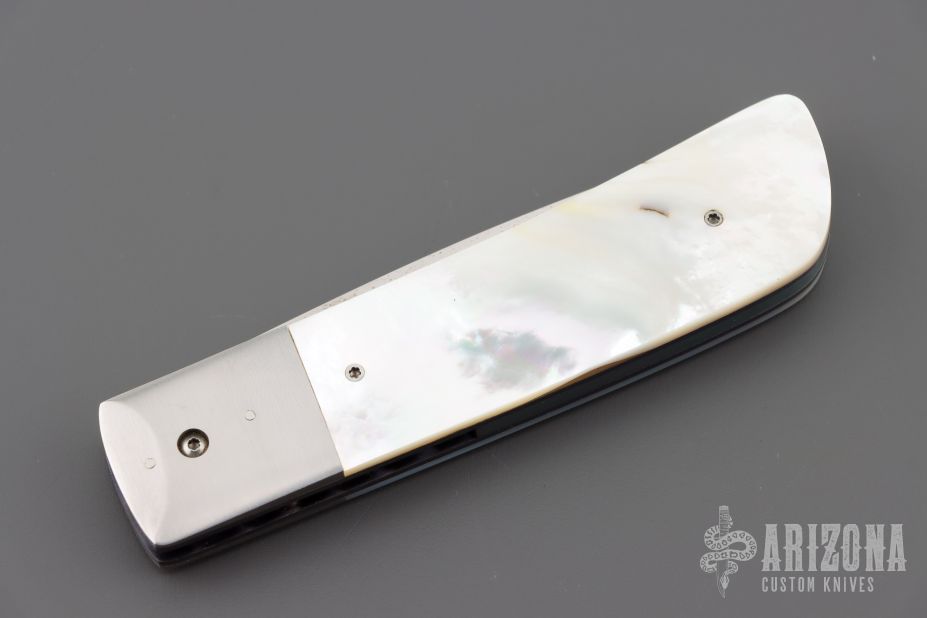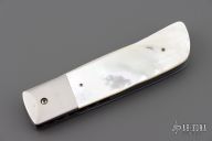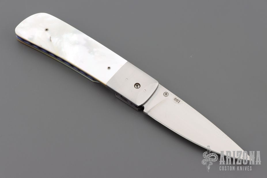 This linerlock by Ken Leverett features a hand rub satin finished blade with single thumbstud. The handle has stainless steel bolsters, gold lip pearl scales, anodized titanium liners with jeweled interiors, anodized titanium backspacer. Nice detent, lockup and blade seating. Comes with a zippered case. Excellent condition. #001