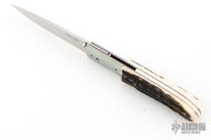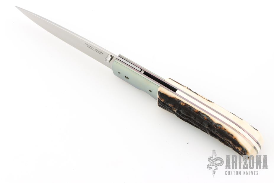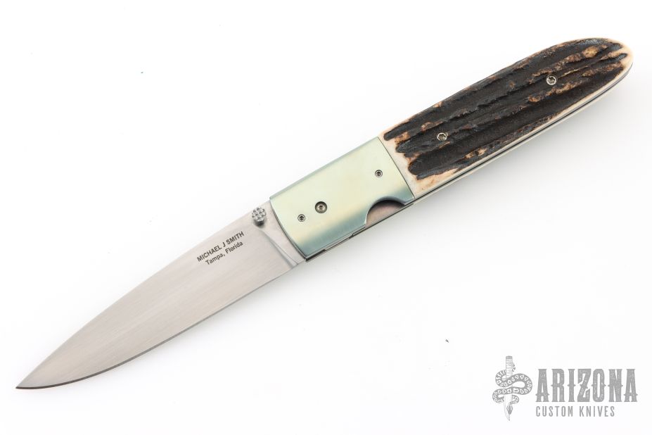This Linerlock by Michael J Smith features a hand rub satin finished blade with a single thumbstud. The handle has anodized titanium bolsters, stag scales, anodized titanium liners, mammoth ivory backspacer. Nice detent, lockup and blade seating. Comes with a zippered case. Excellent condition.